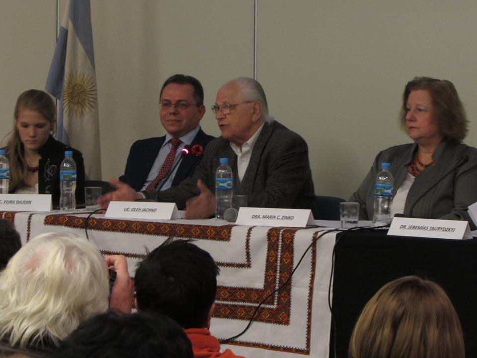 El primer orador fue el Embajador de Ucrania en la Argentina, Yurii Diudin, quien describió los logros de Ucrania durante los 25 años de su independencia. Puso énfasis en los a los eventos conmemorativos que se llevarán a cabo en Ucrania los días 8 y 9 de mayo del año corriente en relación con el Día de la Memoria y Reconciliación y el 71 aniversario de la victoria sobre el nazismo en Europa. Relató la lucha contra la corrupción que viene realizando el gobierno de Petró Poroshenko y otros logros a nivel económico social, y político.