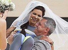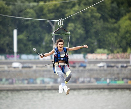 La conocida y exitosa cantante Ruslana, bajó en paracaídas (en realidad en un cablecarril) para su propio casamiento, obviamente sin un vestido de novia pero con velo.