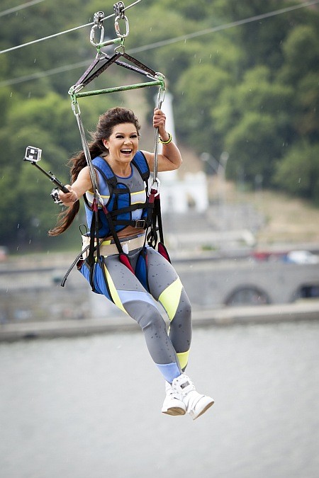 Ruslana es una apasionada por los deportes extremos, y bajó, con un traje sport, desde el “cielo” al escenario. Alli saludó a la conductora televisiva de su programa “Vida mundana” en el día de su cumpleaños, e interpretó una hermosa canción.