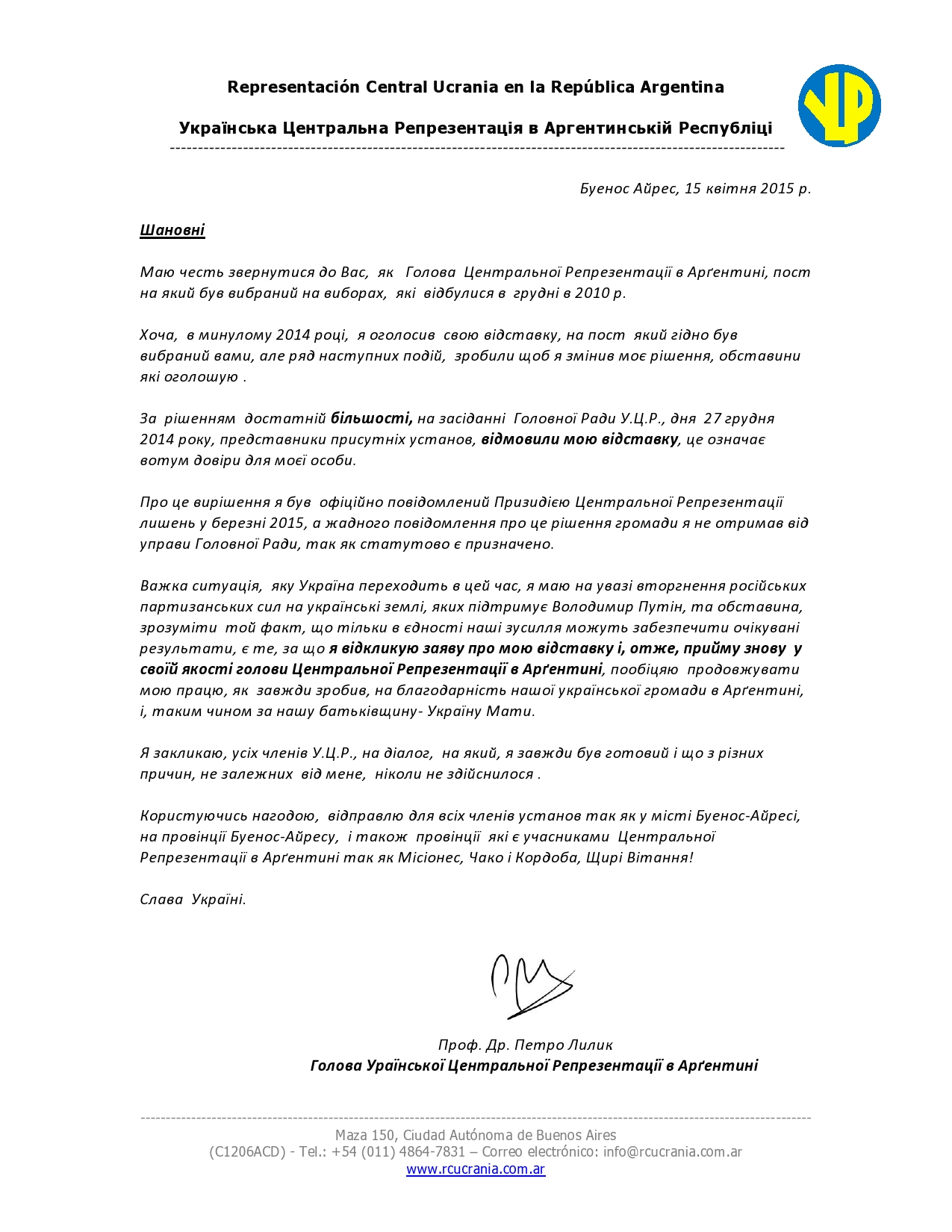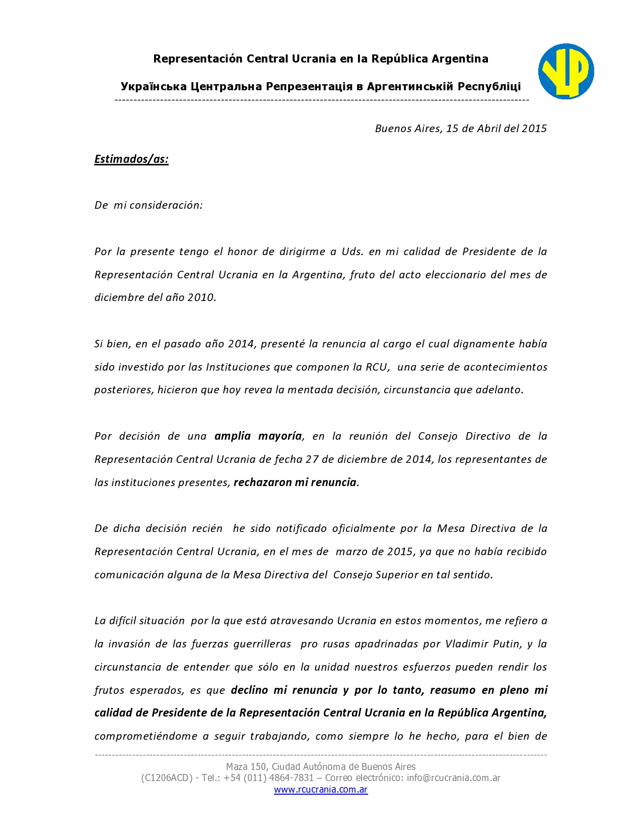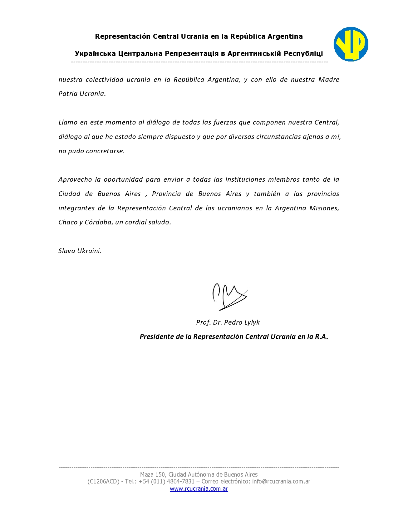 Navegación de entradas COMUNICADO DE LA REPRESENTACIÓN CENTRAL UCRANIA EN LA REPÚBLICA ARGENTINA INVITACIÓN A LA MESA REDONDA SOBRE «LITERATURA UCRANIA EN LA FERIA DEL LIBRO» CON LA PRESENCIA DE LA DIPUTADA NACIONAL DRA. ELISA CARRIO