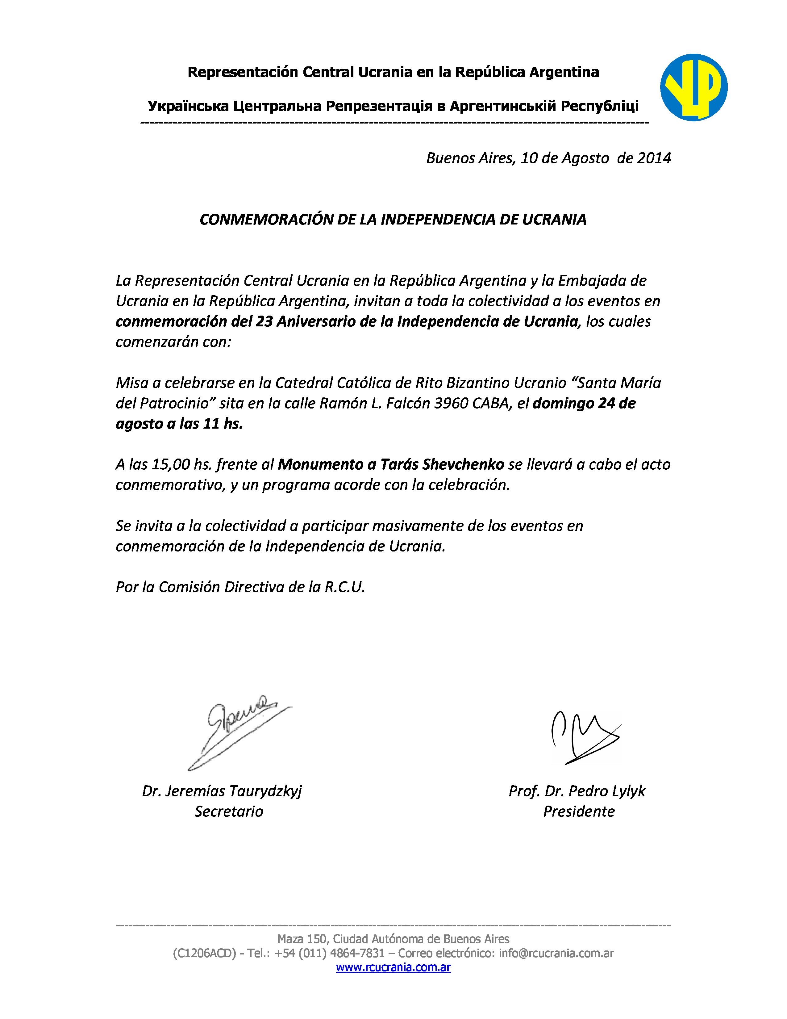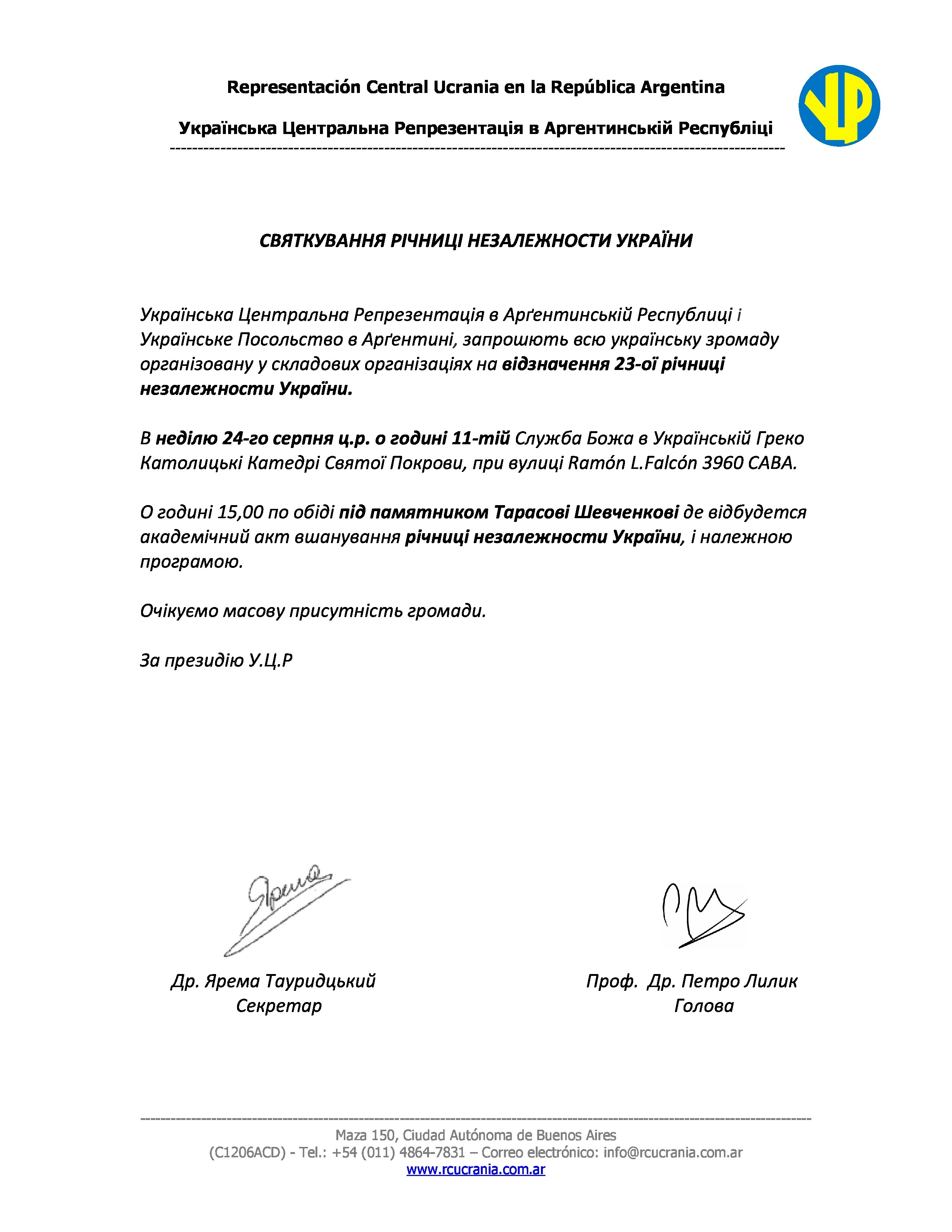 La Representación Central Ucrania en la República Argentina y la Embajada de Ucrania en la República Argentina, invitan a toda la colectividad a los eventos en conmemoración del 23 Aniversario de la Independencia de Ucrania, los cuales comenzarán con: