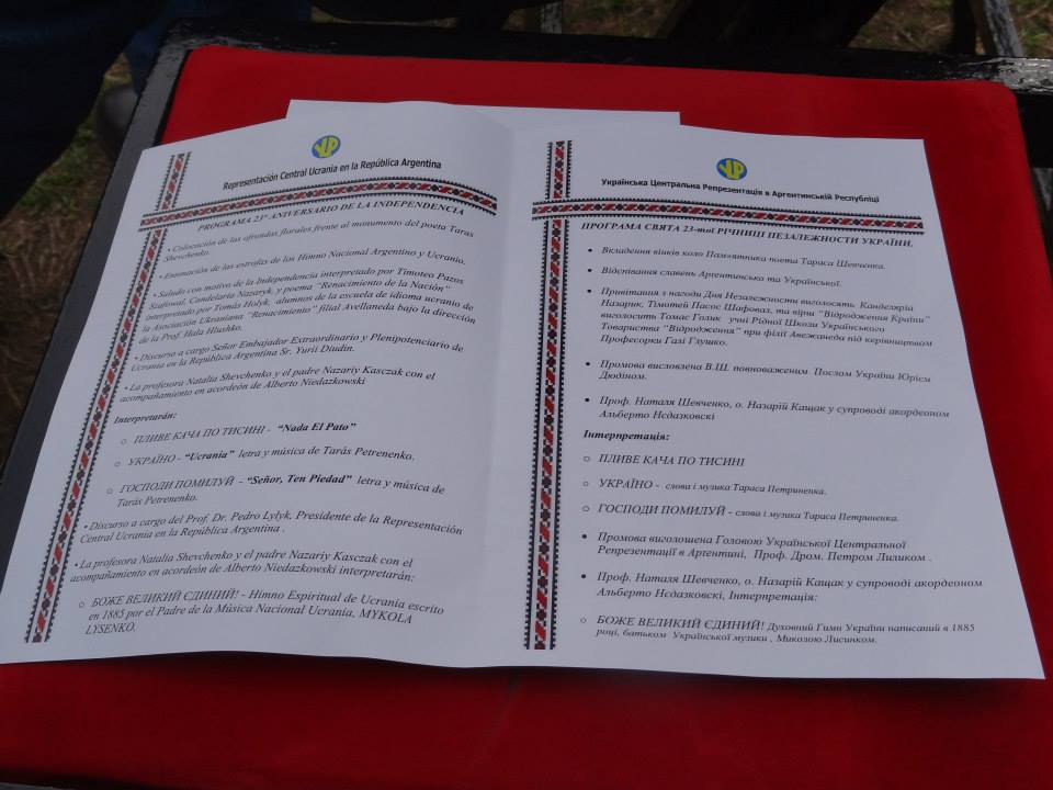El sábado 30 de agosto se llevó a cabo el acto por la Independencia de Ucrania, frente al Monumento a Taras Shevchenko, ubicado en el Parque Tres de Febrero de la Ciudad Autónoma de Buenos Aires, el mismo que estuvo programado para el domingo 24 de agosto y que por razones climáticas se tuvo que suspender. El acto fue organizado por la Representación Central Ucrania en la República Argentina y la Embajada de Ucrania en la República Argentina.