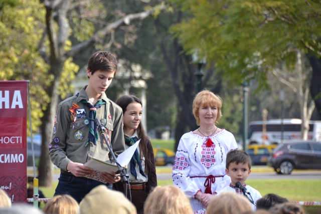 Un grupo de niños y jóvenes, de la Escuela de Idioma Ucranio de la Asociación Ucraniana “Renacimiento” filial Avellaneda, Timoteo Pazos Szafowal, Candelaria Nazaryk y Tomás Holyk, bajo la dirección de la profesora Hala Hlushko, presentaron un saludo con motivo de la Independencia de Ucrania.