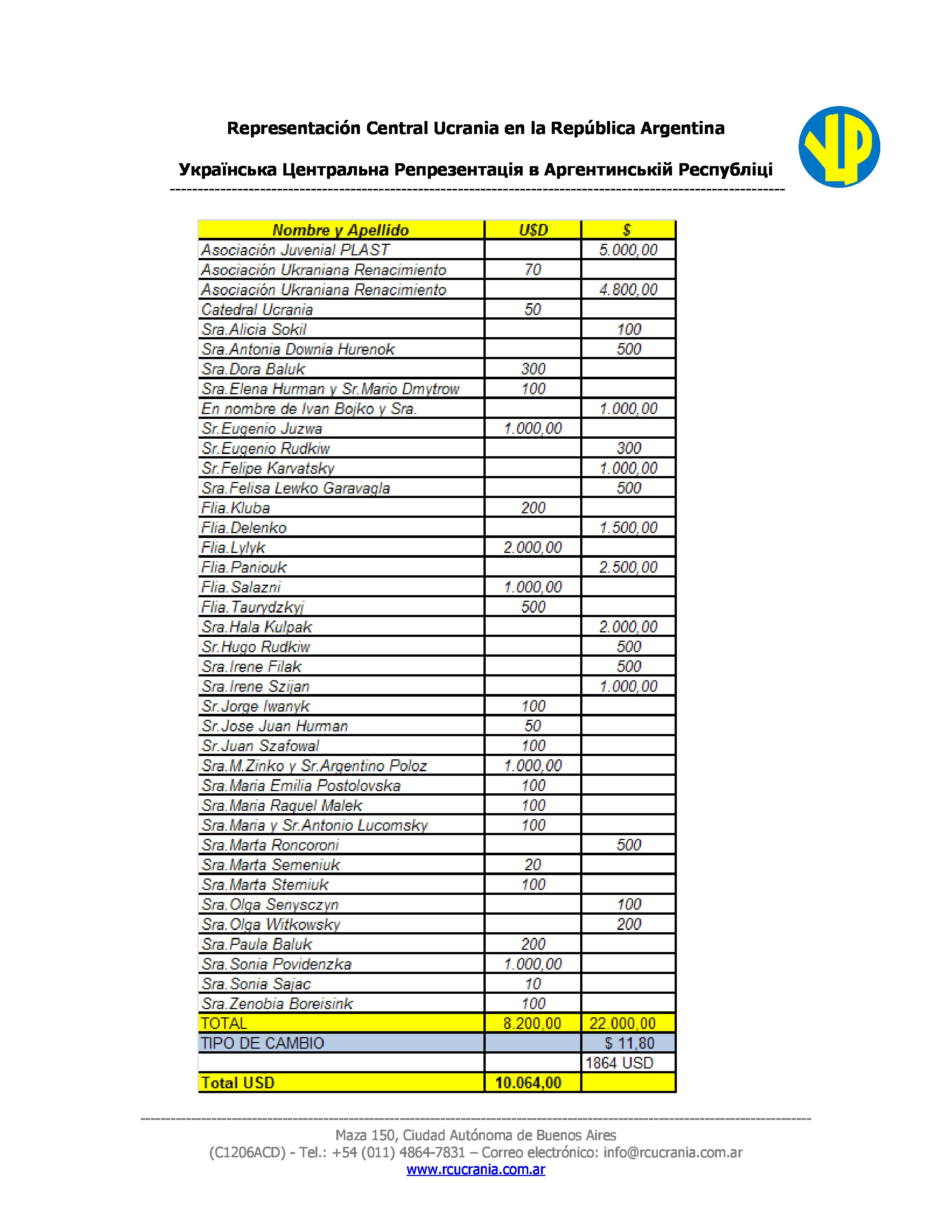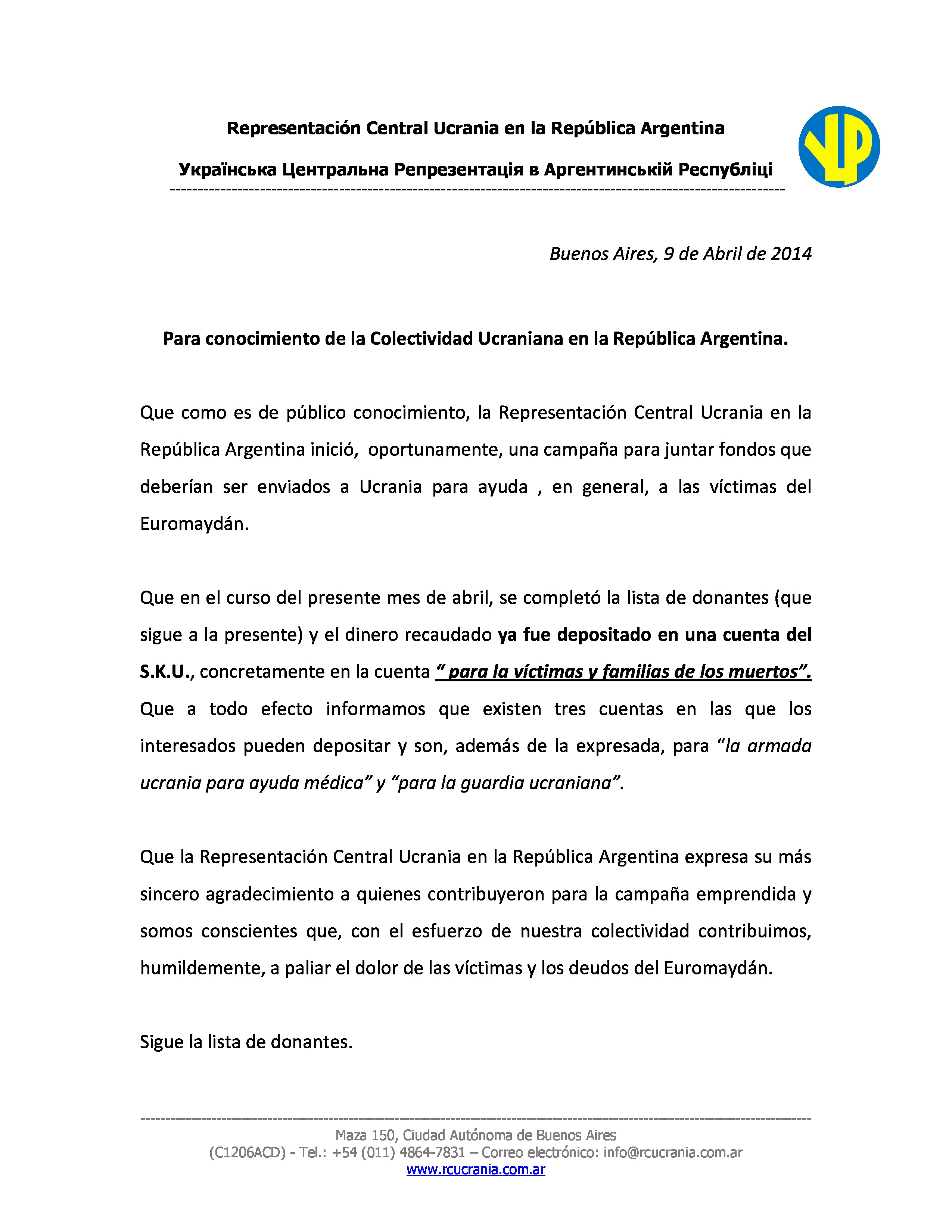 DONACIÓN DE LA COLECTIVIDAD ARGENTINA HACIA LOS FAMILIARES Y VICTIMAS DEL EUROMAYDAN