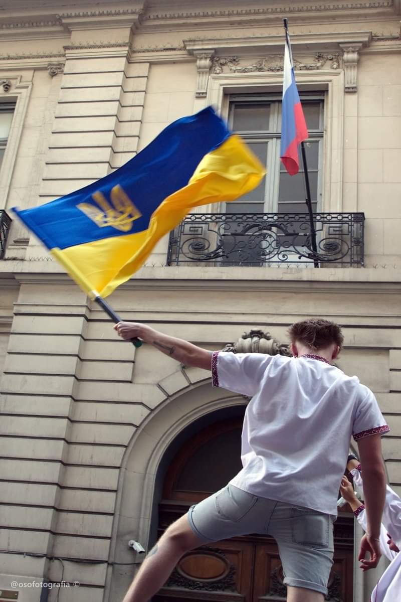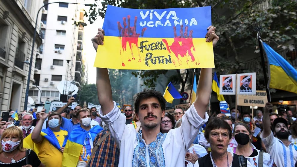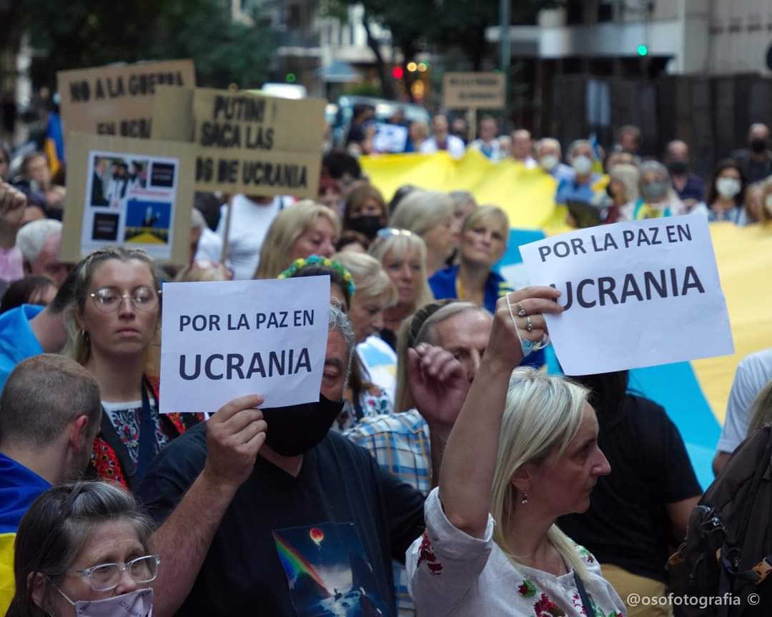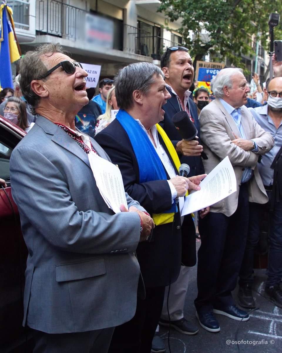 En Argentina, más de 1000 personas, entre ellas inmigrantes ucranianos y argentinos descendientes de ucranianos a cuales se sumaban los argentinos, se manifestaron el viernes 27/02/2022 en Buenos Aires, pidiendo ante la embajada rusa “la retirada incondicional” de las tropas del “asesino” Putin.