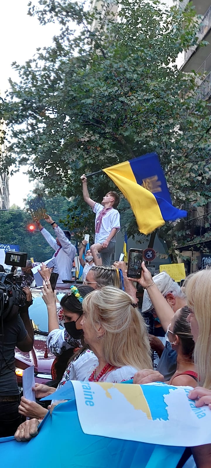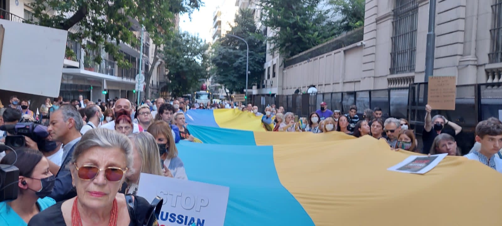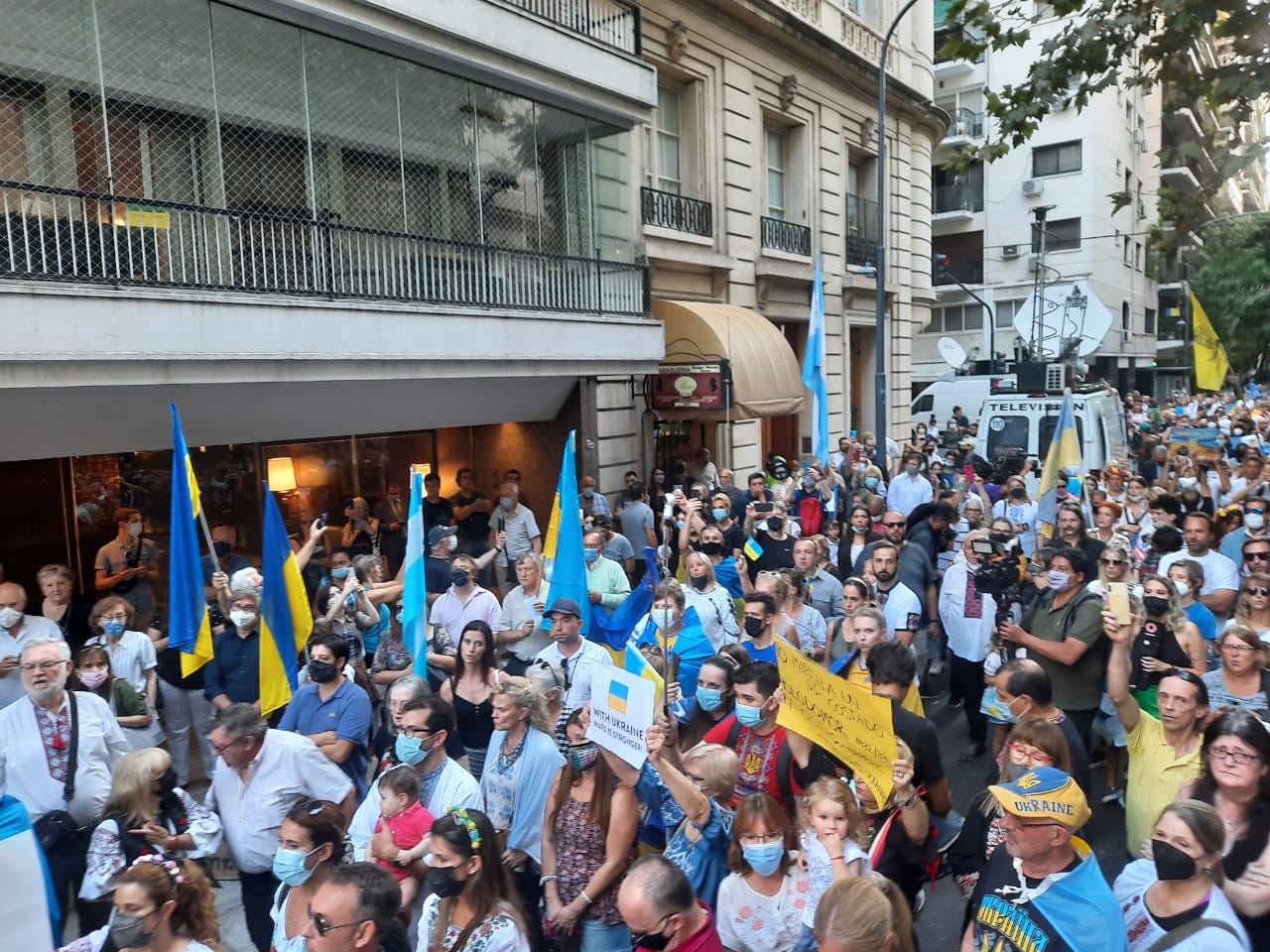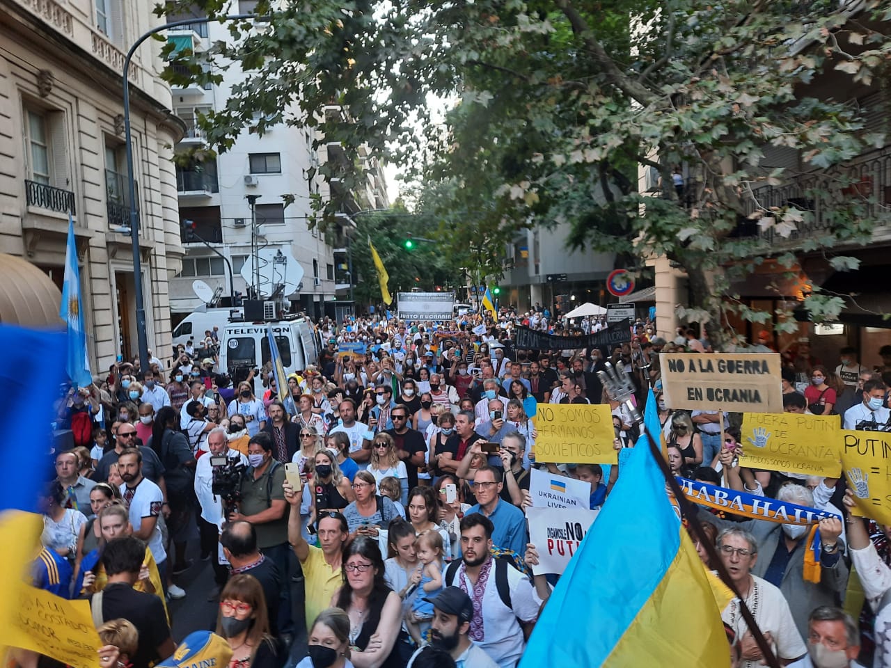 En Argentina, más de 1000 personas, entre ellas inmigrantes ucranianos y argentinos descendientes de ucranianos a cuales se sumaban los argentinos, se manifestaron el viernes 27/02/2022 en Buenos Aires, pidiendo ante la embajada rusa “la retirada incondicional” de las tropas del “asesino” Putin.