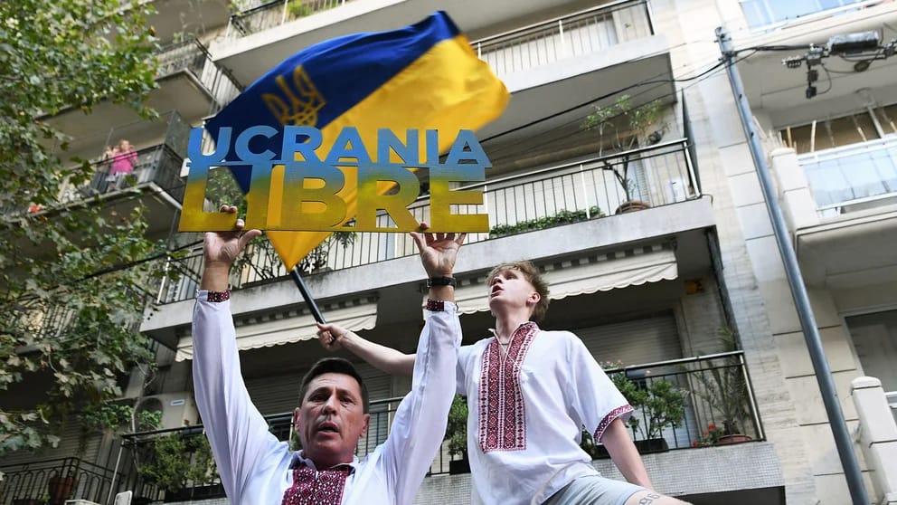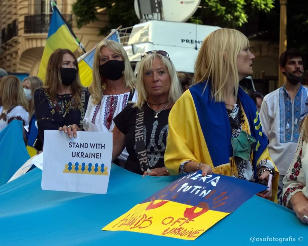 Todos en marcha pacífica con las banderas ucranianas, vestidos con trajes tradicionales, con pancartas en español, ucraniano o inglés diciendo “Alto a la guerra” o “Putin retira tus manos de Ucrania”, los manifestantes corearon eslóganes en ucraniano, como “Gloria a Ucrania, gloria a sus héroes” y entonaron los himnos ucraniano y argentino.