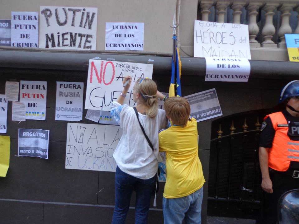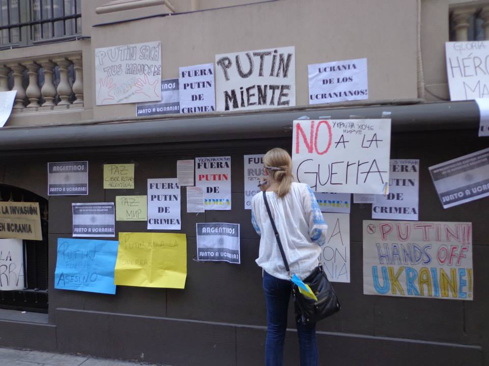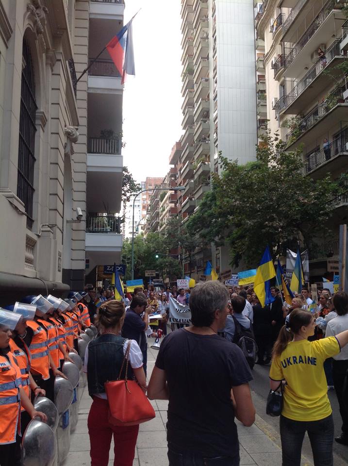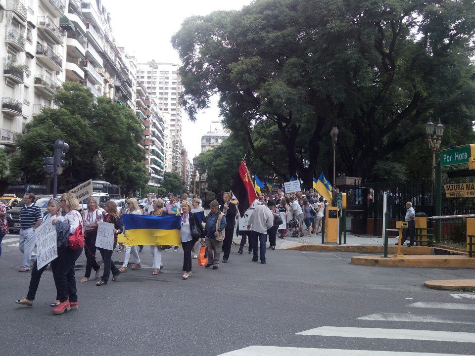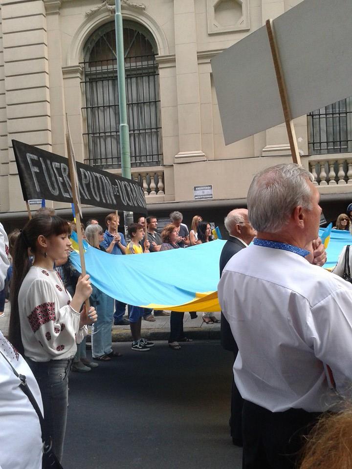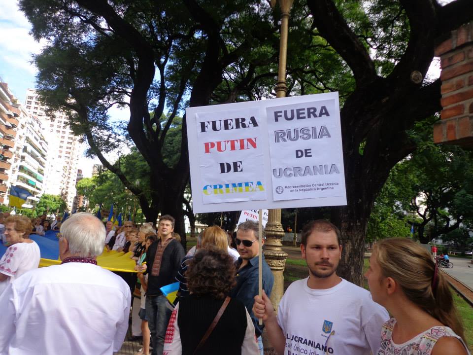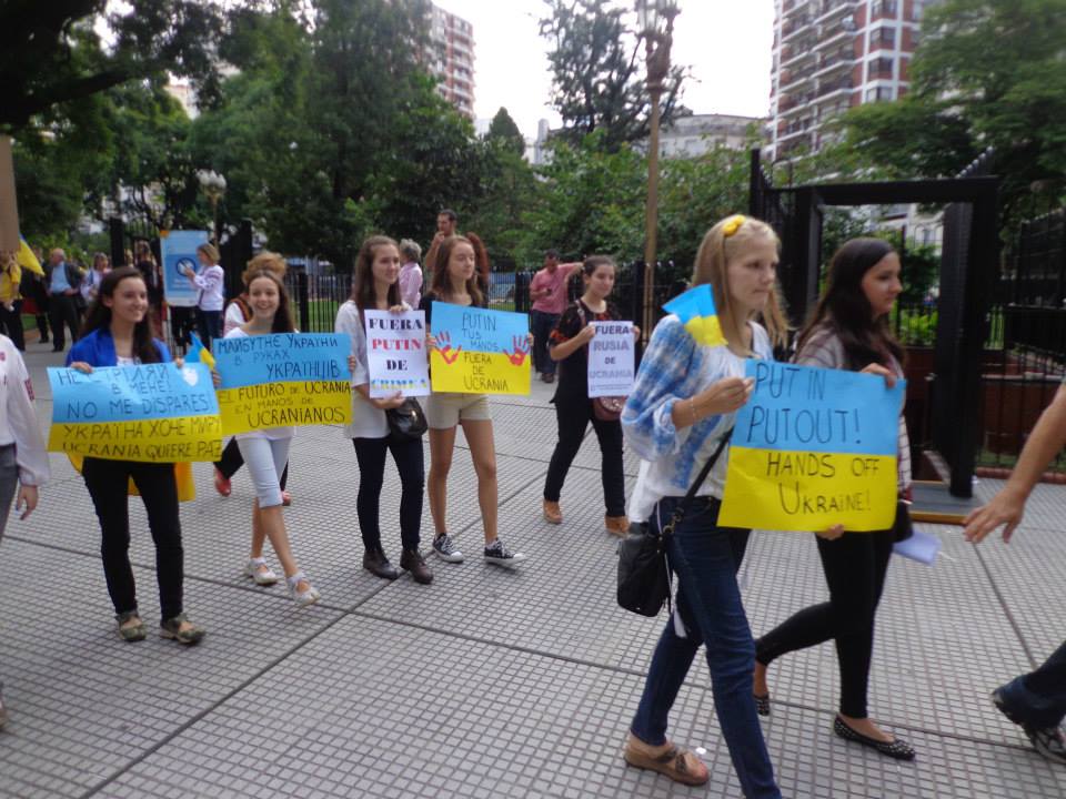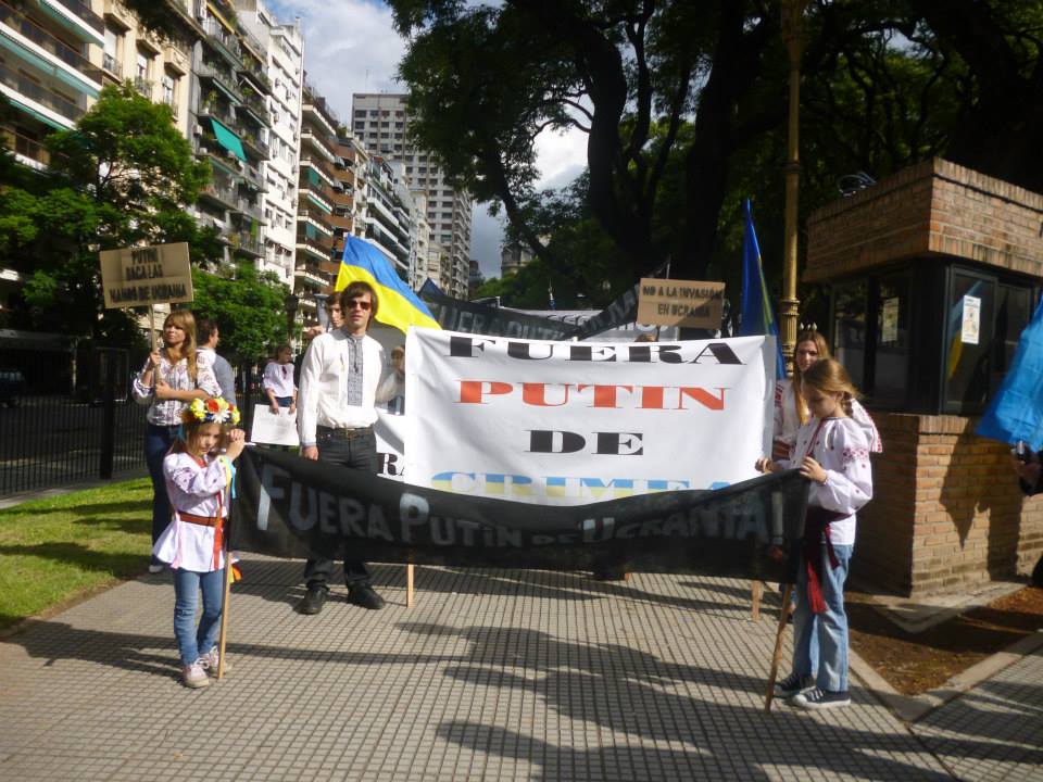 Con las banderas ucranias y con carteles expresando frases alusivas al acontecimiento, tales como “Fuera Putin de Crimea”, “No a la guerra en Ucrania”, “Fuera Putin de Ucrania”, “Putin saca las manos de ucranias”, entre otras. La columna se dirigió frente a la Embajada de la Federación de Rusia en la República Argentina.
