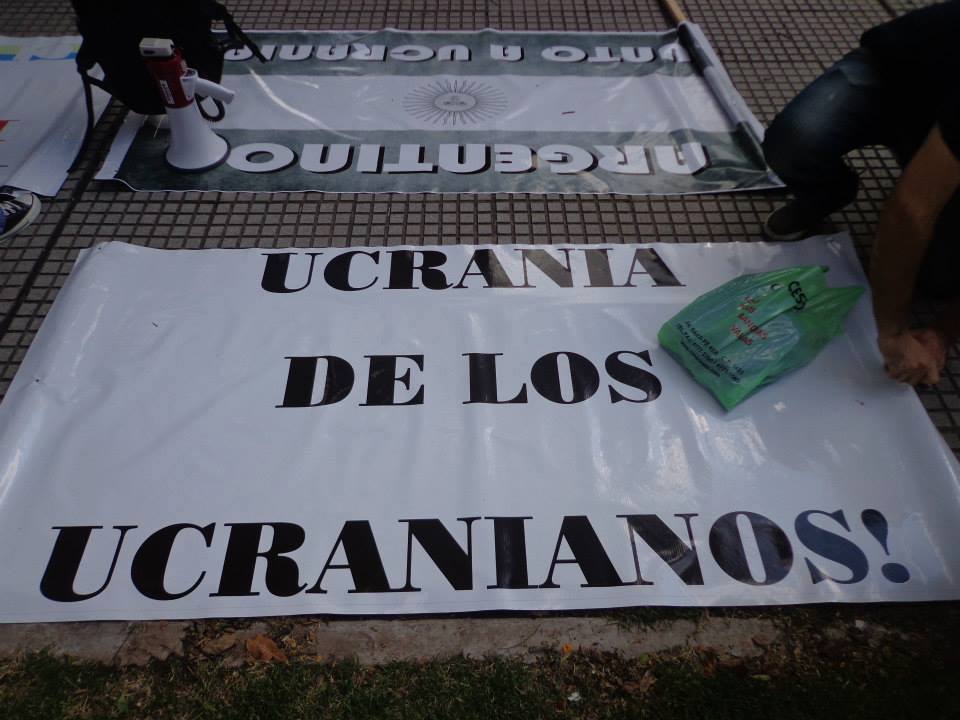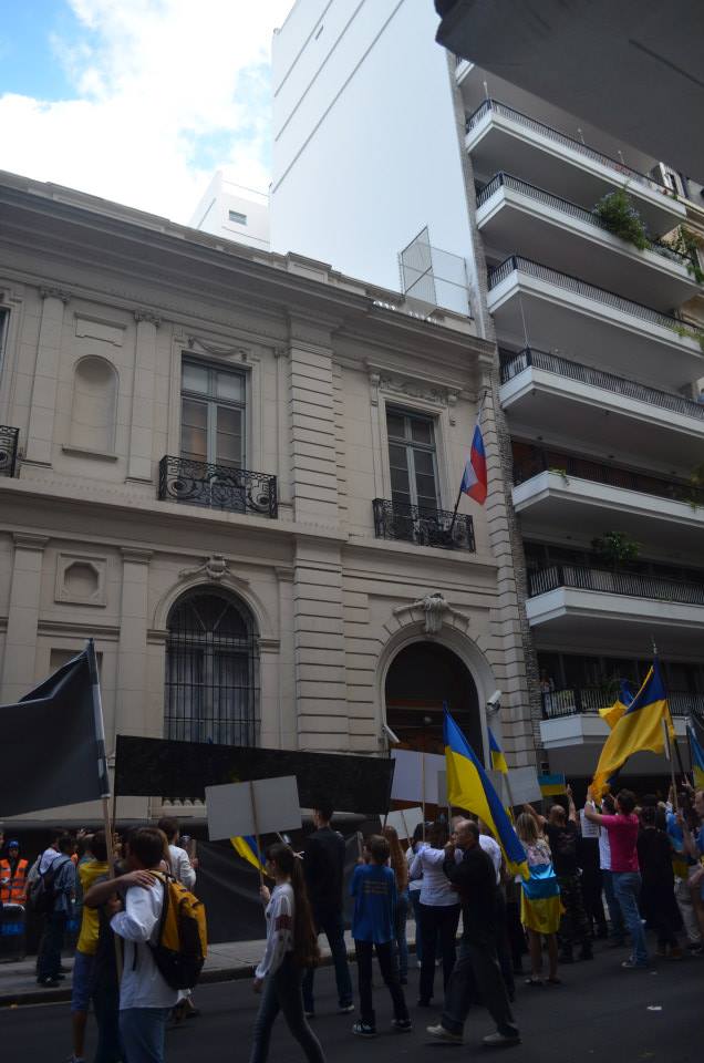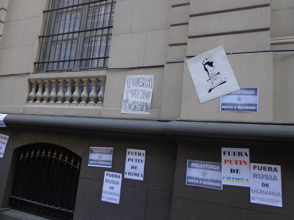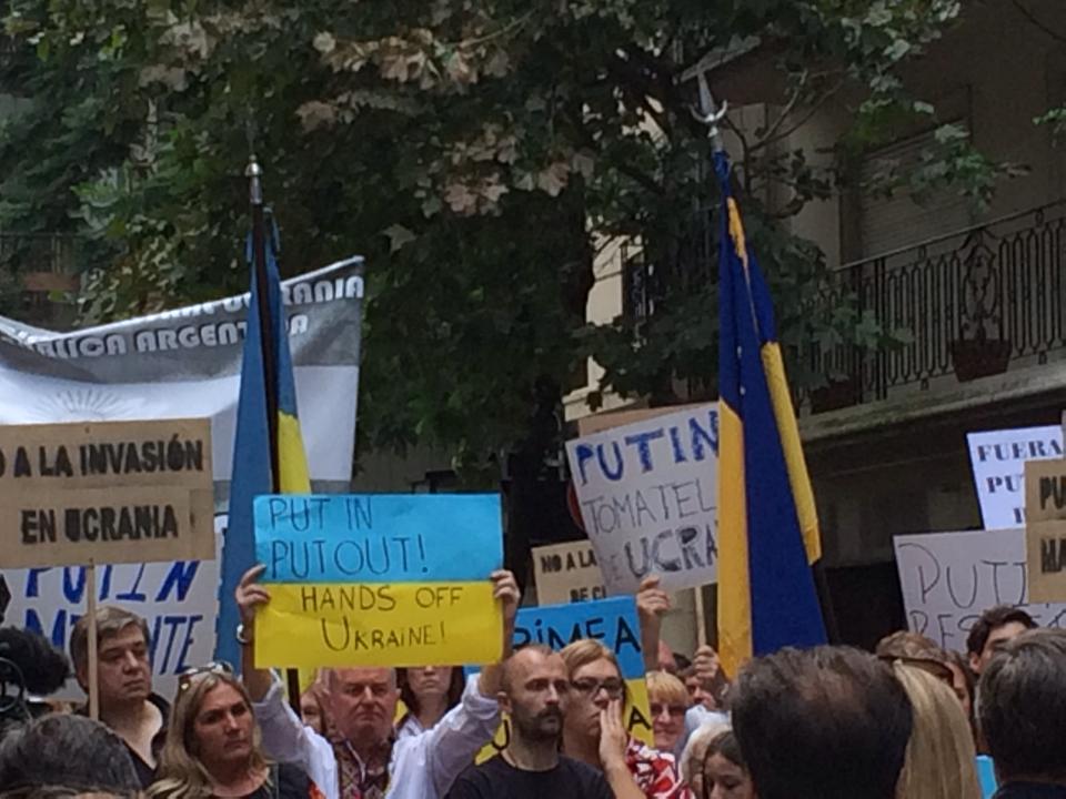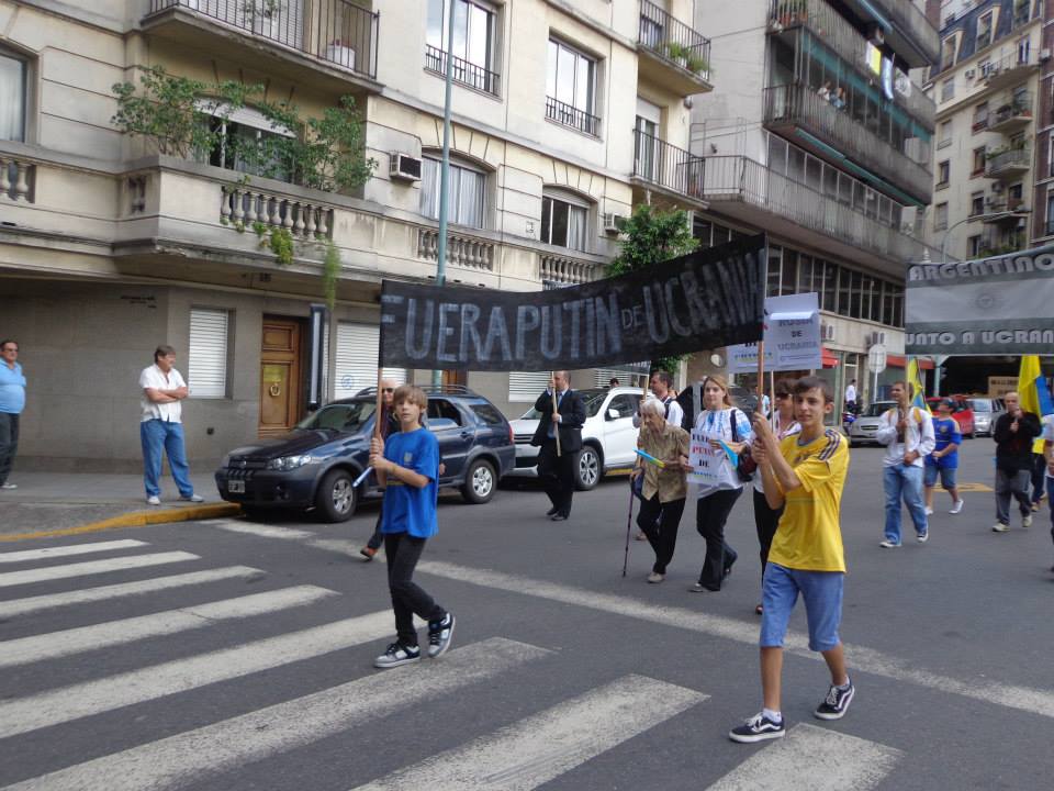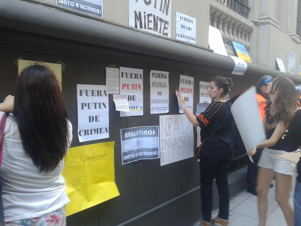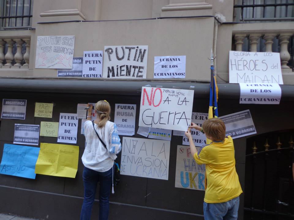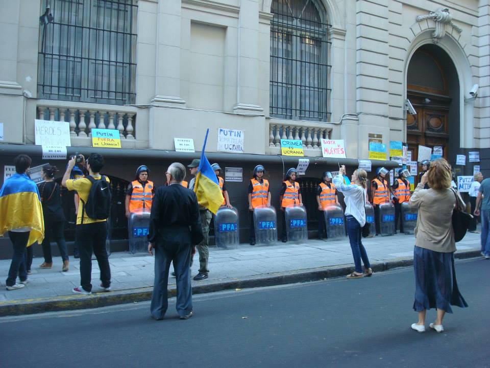 Con las banderas ucranias y con carteles expresando frases alusivas al acontecimiento, tales como “Fuera Putin de Crimea”, “No a la guerra en Ucrania”, “Fuera Putin de Ucrania”, “Putin saca las manos de ucranias”, entre otras. La columna se dirigió frente a la Embajada de la Federación de Rusia en la República Argentina.