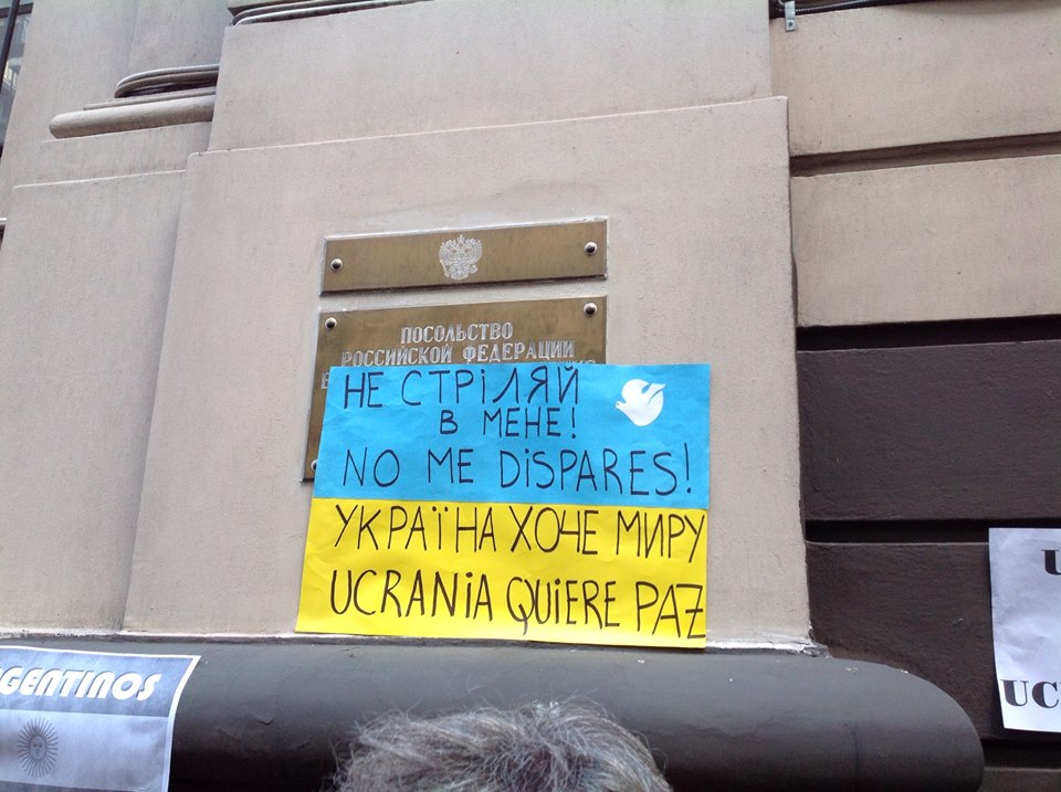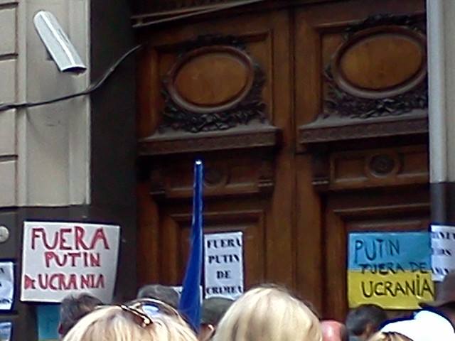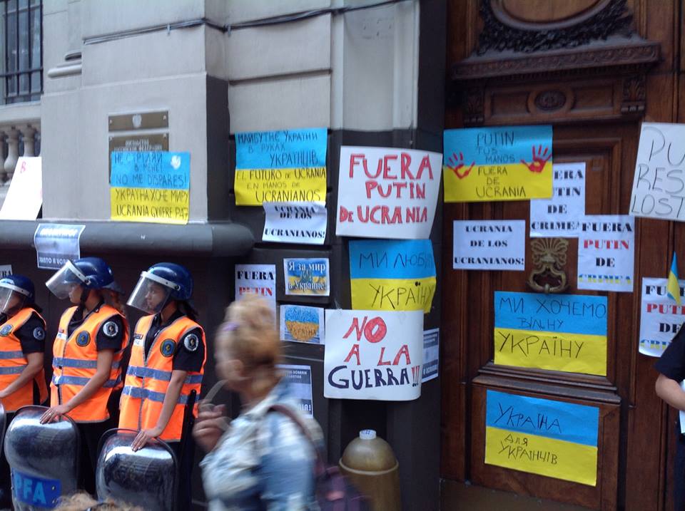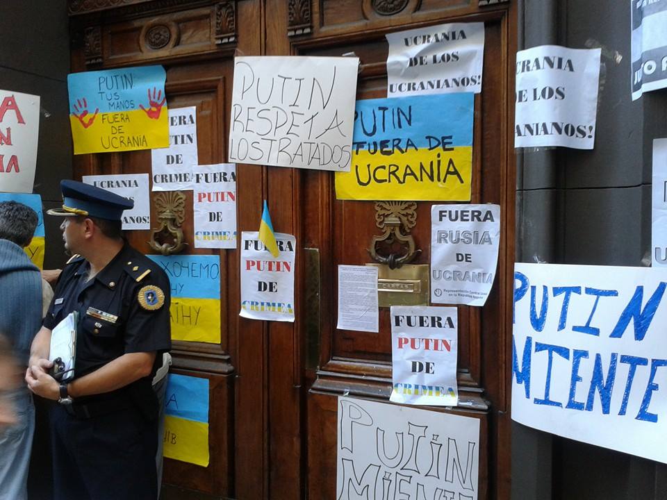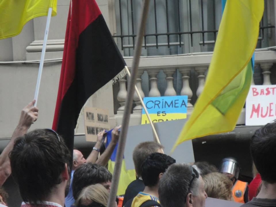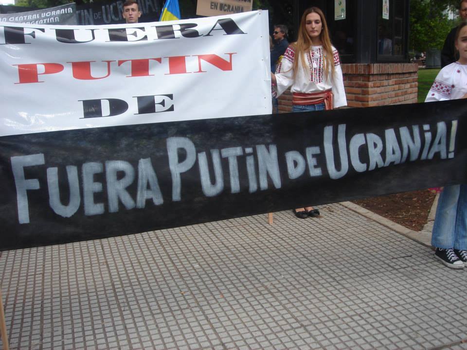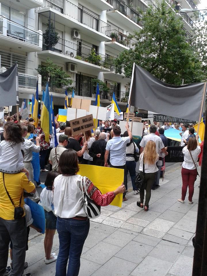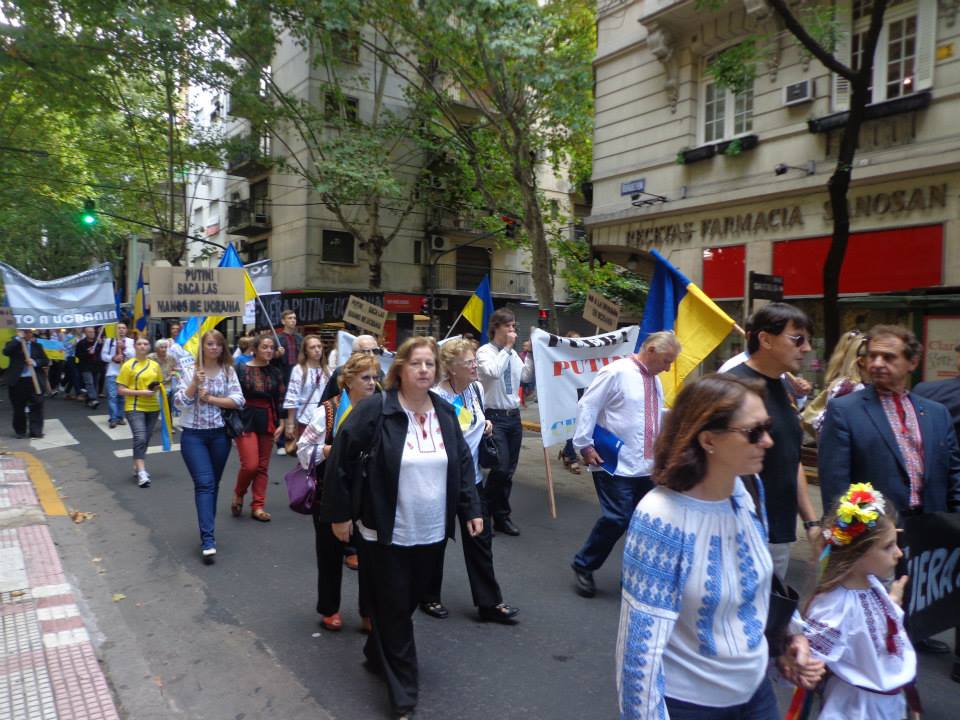 Con las banderas ucranias y con carteles expresando frases alusivas al acontecimiento, tales como “Fuera Putin de Crimea”, “No a la guerra en Ucrania”, “Fuera Putin de Ucrania”, “Putin saca las manos de ucranias”, entre otras. La columna se dirigió frente a la Embajada de la Federación de Rusia en la República Argentina.