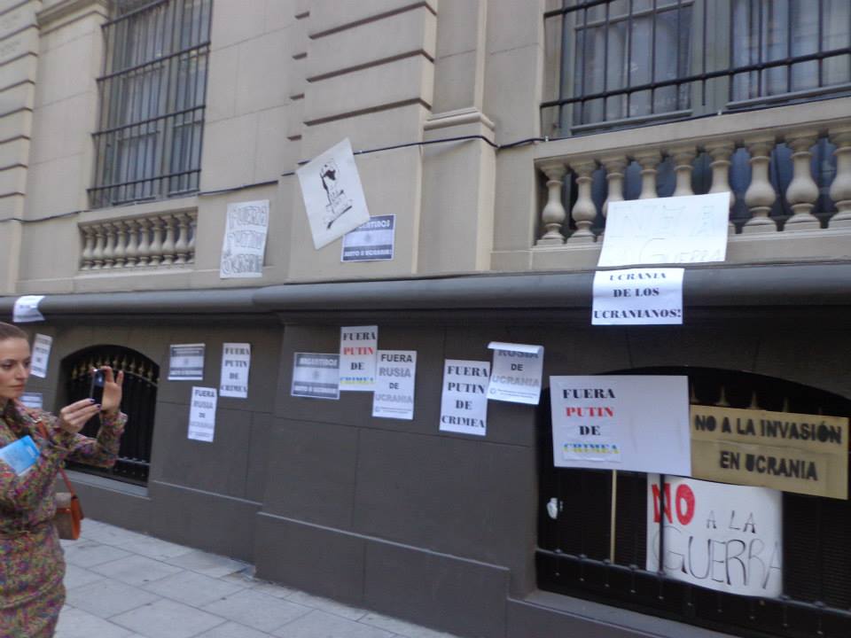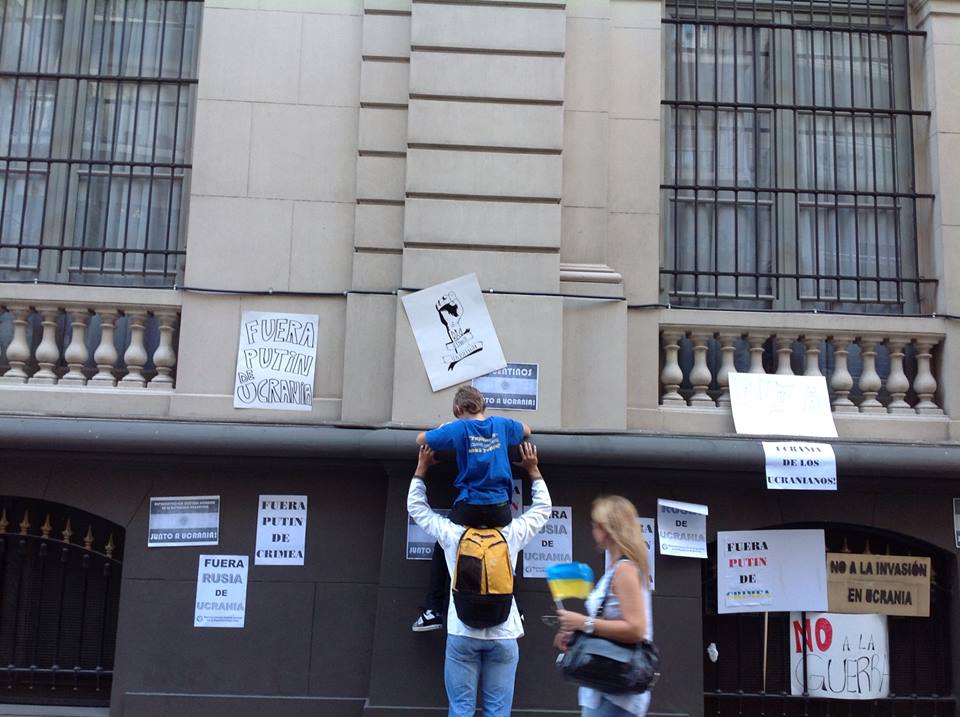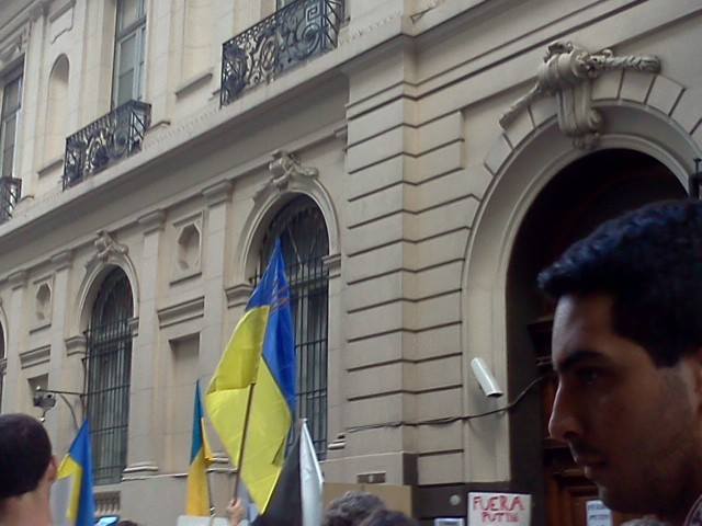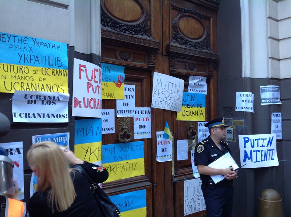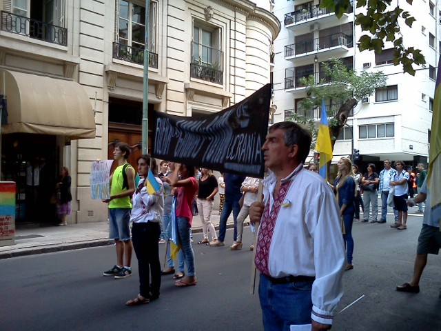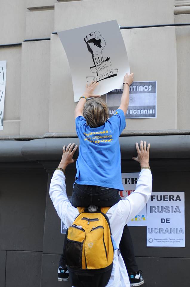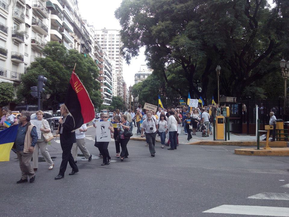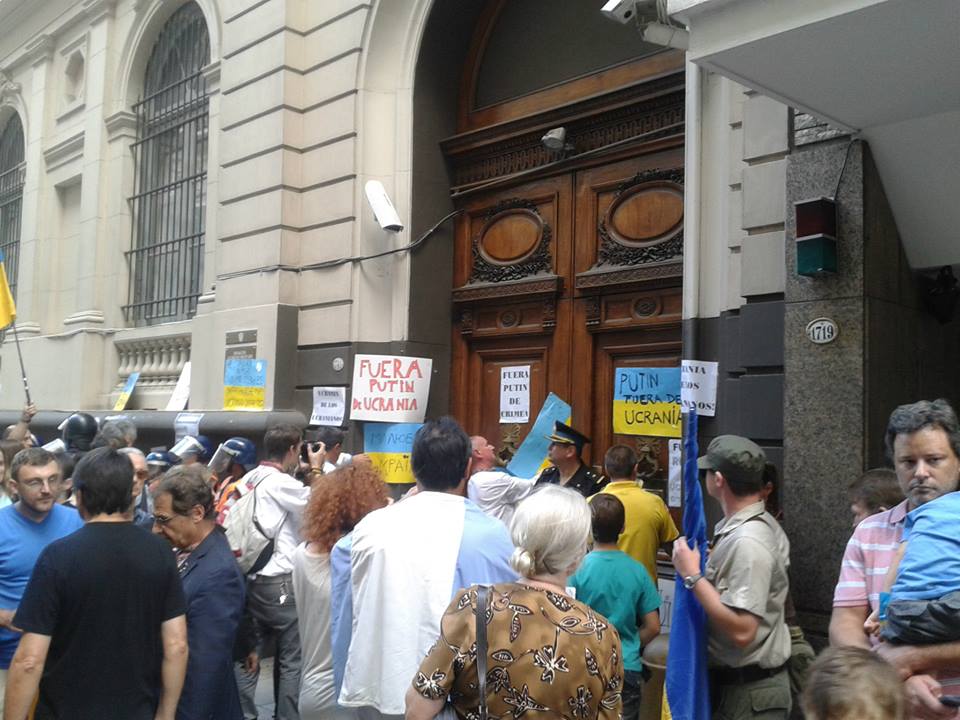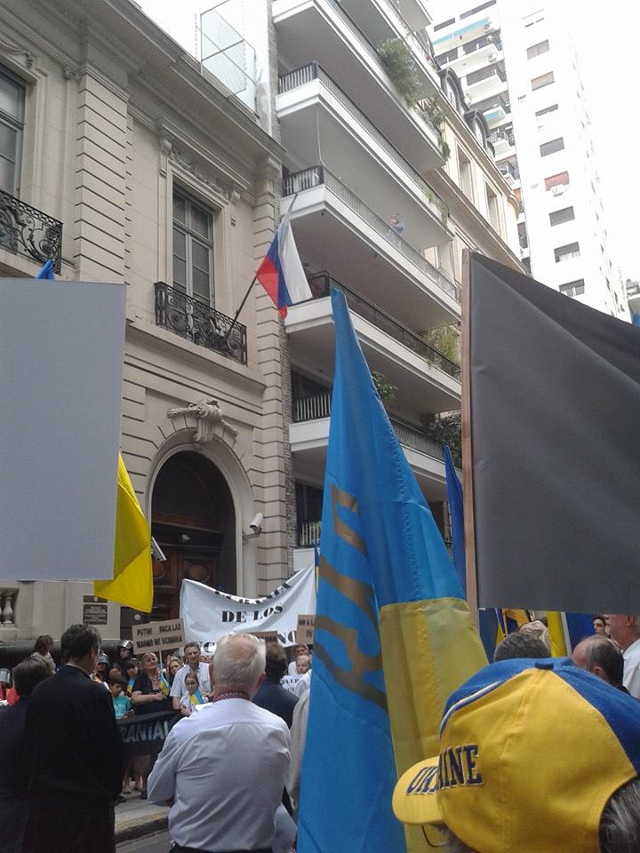 Con las banderas ucranias y con carteles expresando frases alusivas al acontecimiento, tales como “Fuera Putin de Crimea”, “No a la guerra en Ucrania”, “Fuera Putin de Ucrania”, “Putin saca las manos de ucranias”, entre otras. La columna se dirigió frente a la Embajada de la Federación de Rusia en la República Argentina.
