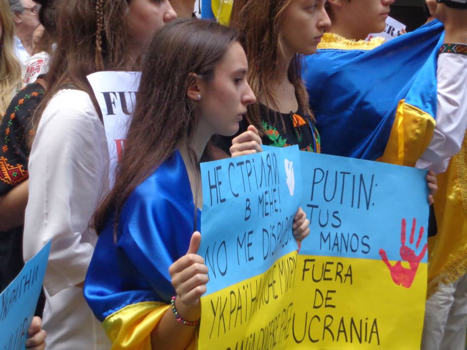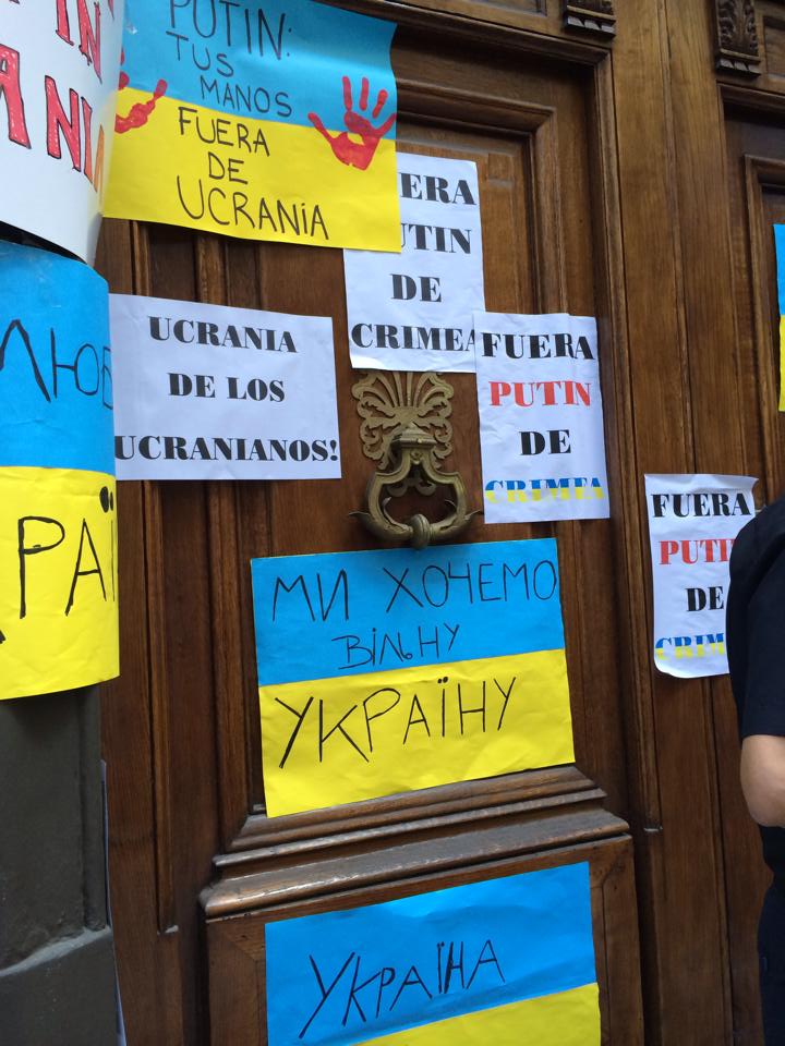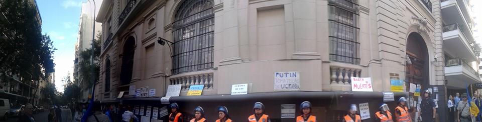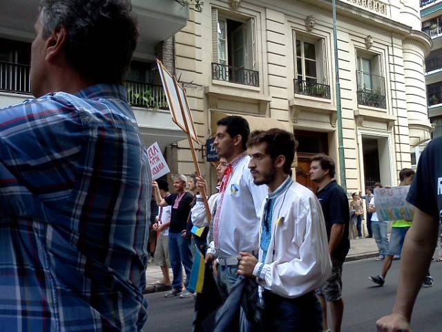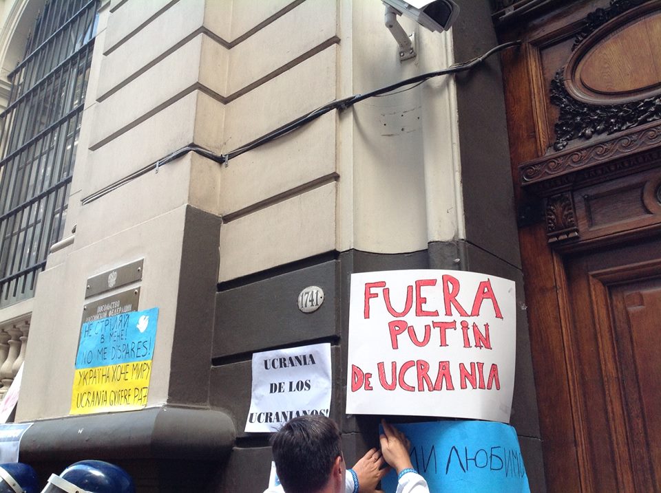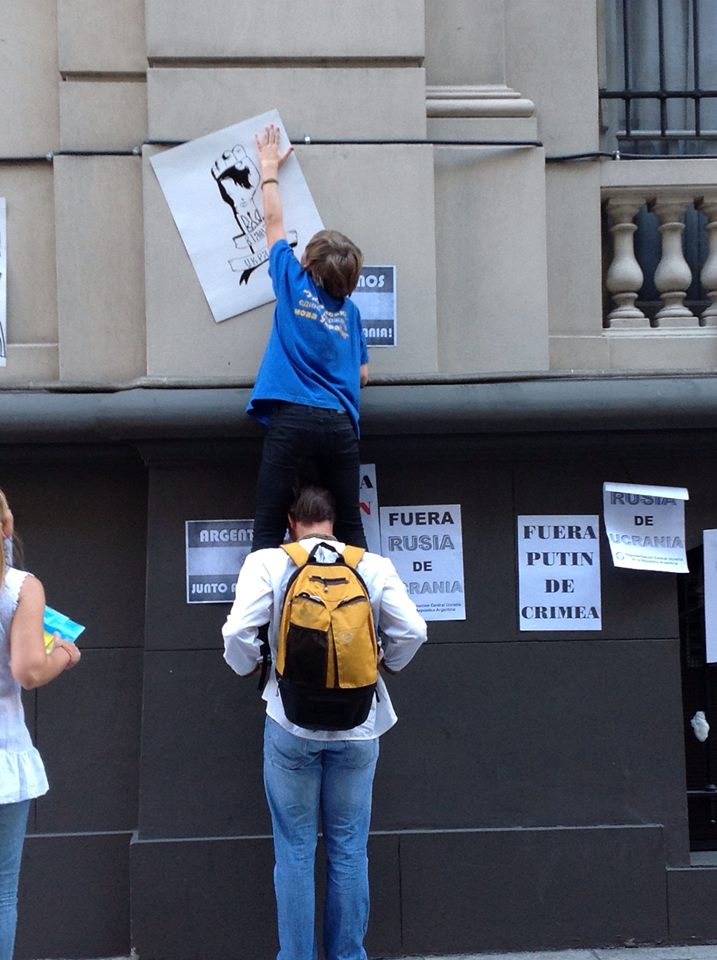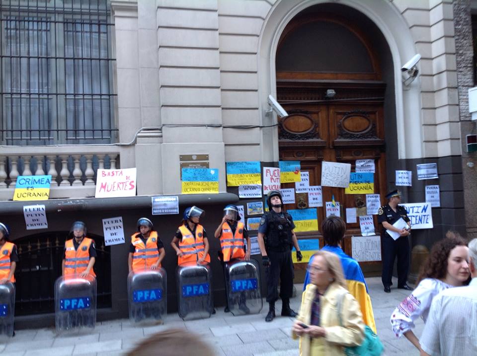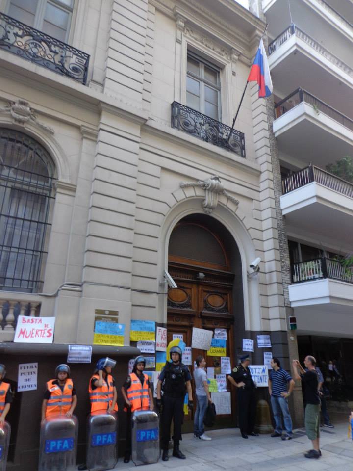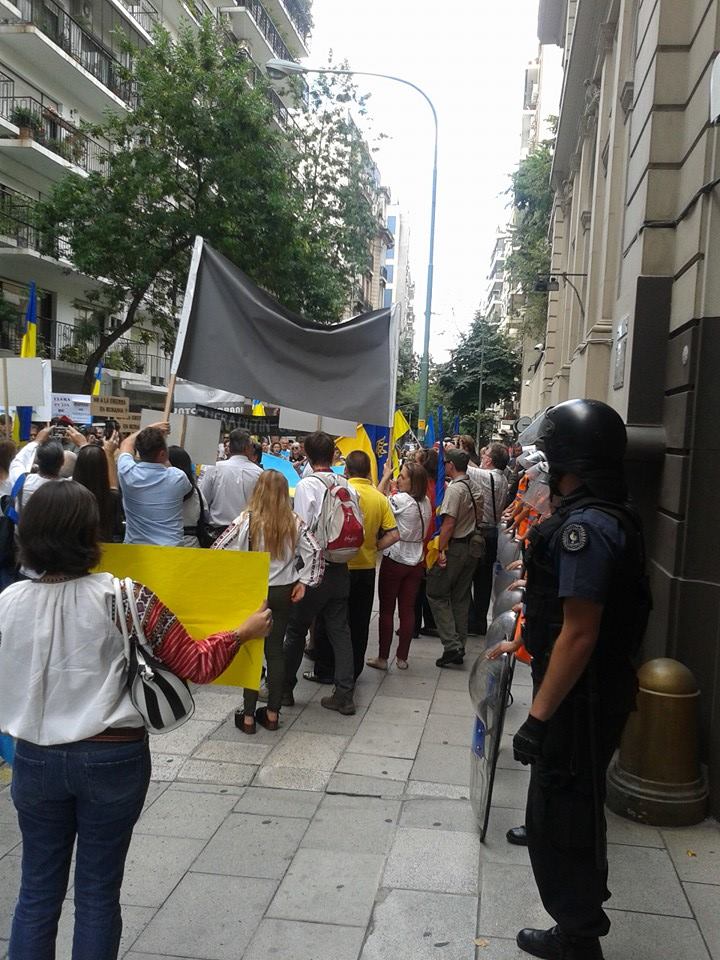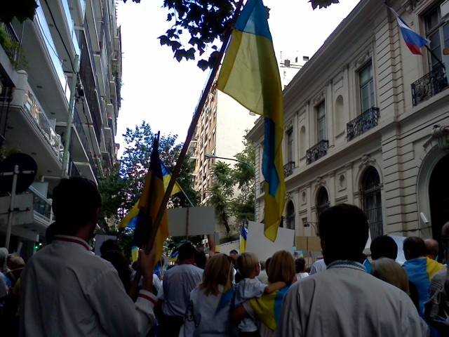 Con las banderas ucranias y con carteles expresando frases alusivas al acontecimiento, tales como “Fuera Putin de Crimea”, “No a la guerra en Ucrania”, “Fuera Putin de Ucrania”, “Putin saca las manos de ucranias”, entre otras. La columna se dirigió frente a la Embajada de la Federación de Rusia en la República Argentina.