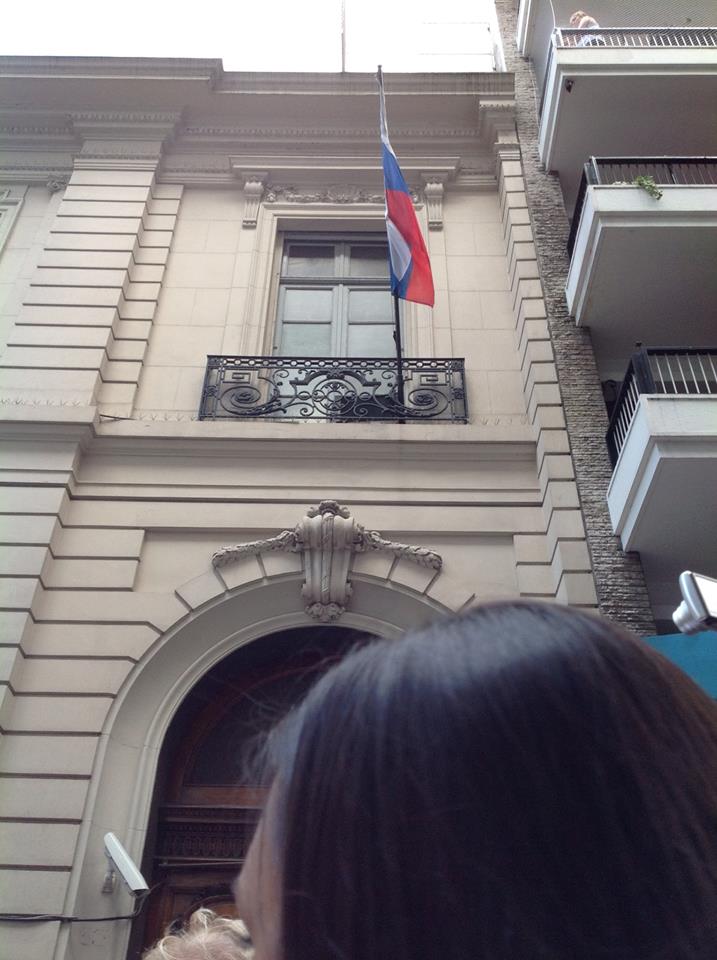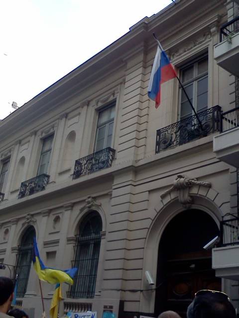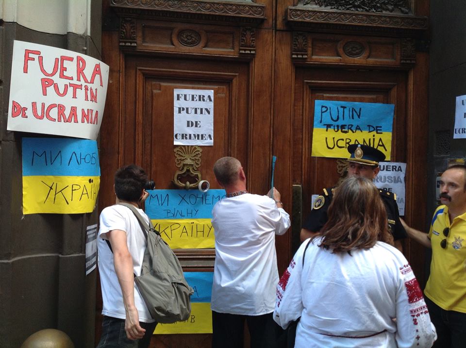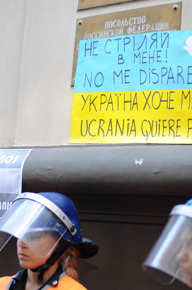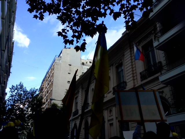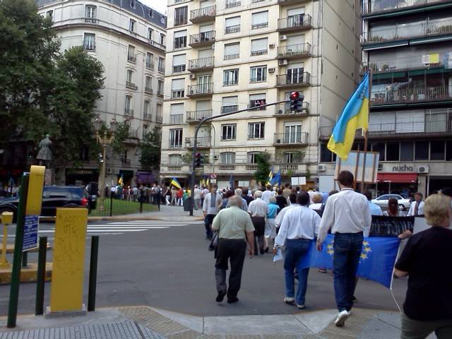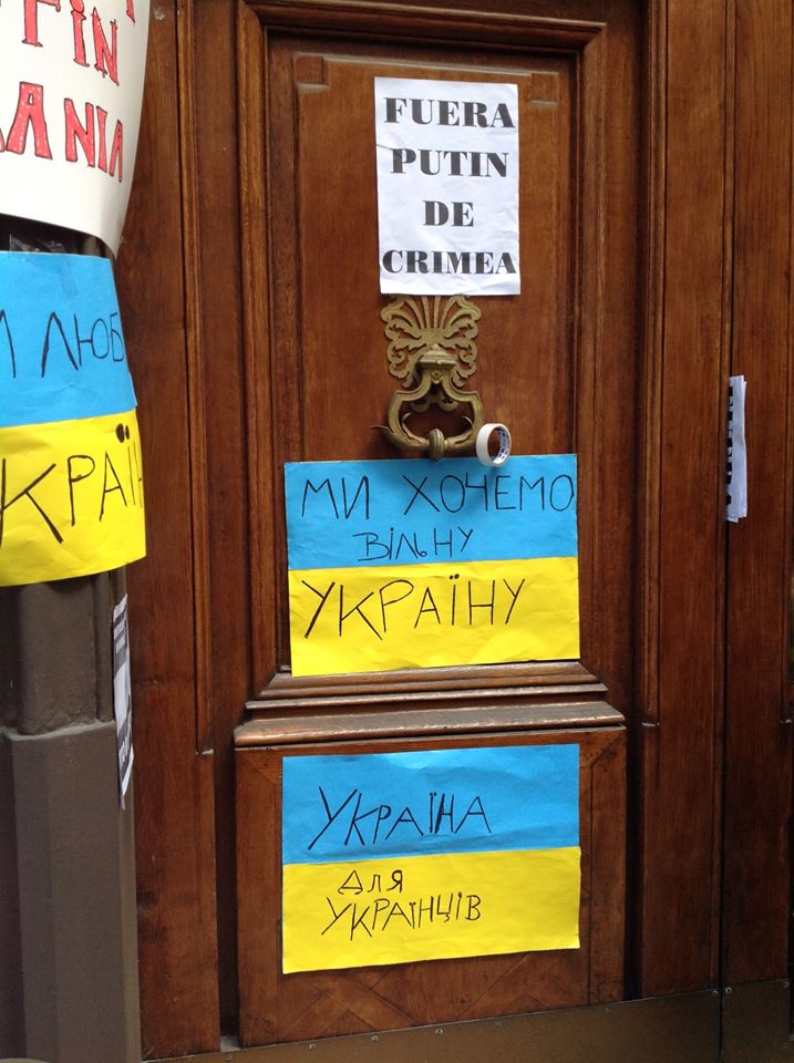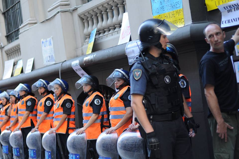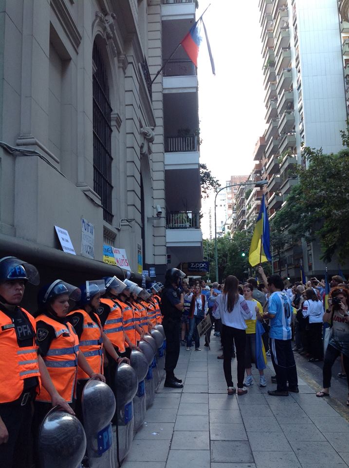 Con las banderas ucranias y con carteles expresando frases alusivas al acontecimiento, tales como “Fuera Putin de Crimea”, “No a la guerra en Ucrania”, “Fuera Putin de Ucrania”, “Putin saca las manos de ucranias”, entre otras. La columna se dirigió frente a la Embajada de la Federación de Rusia en la República Argentina.