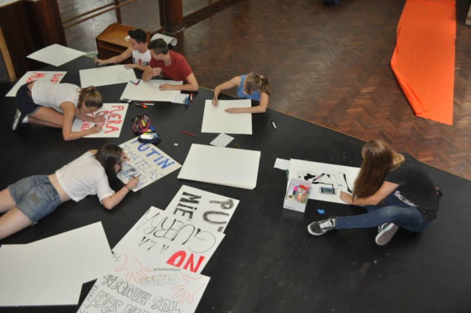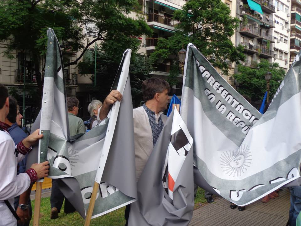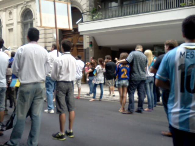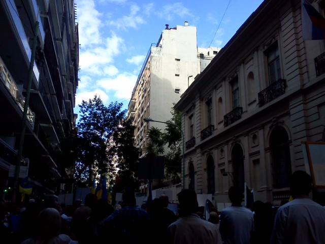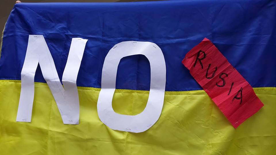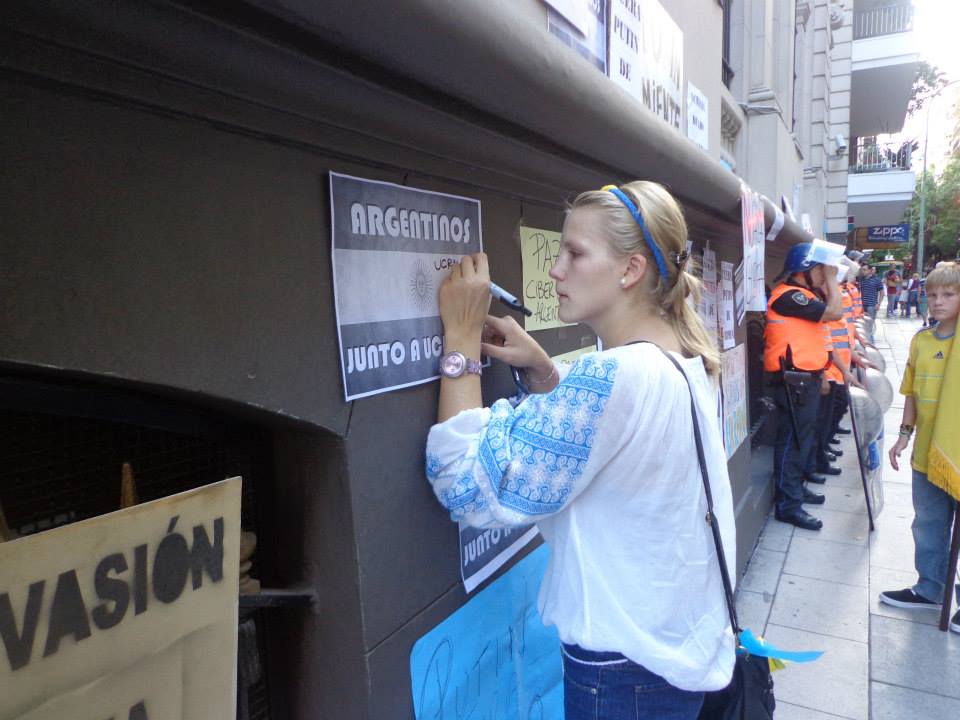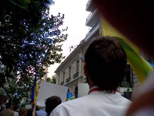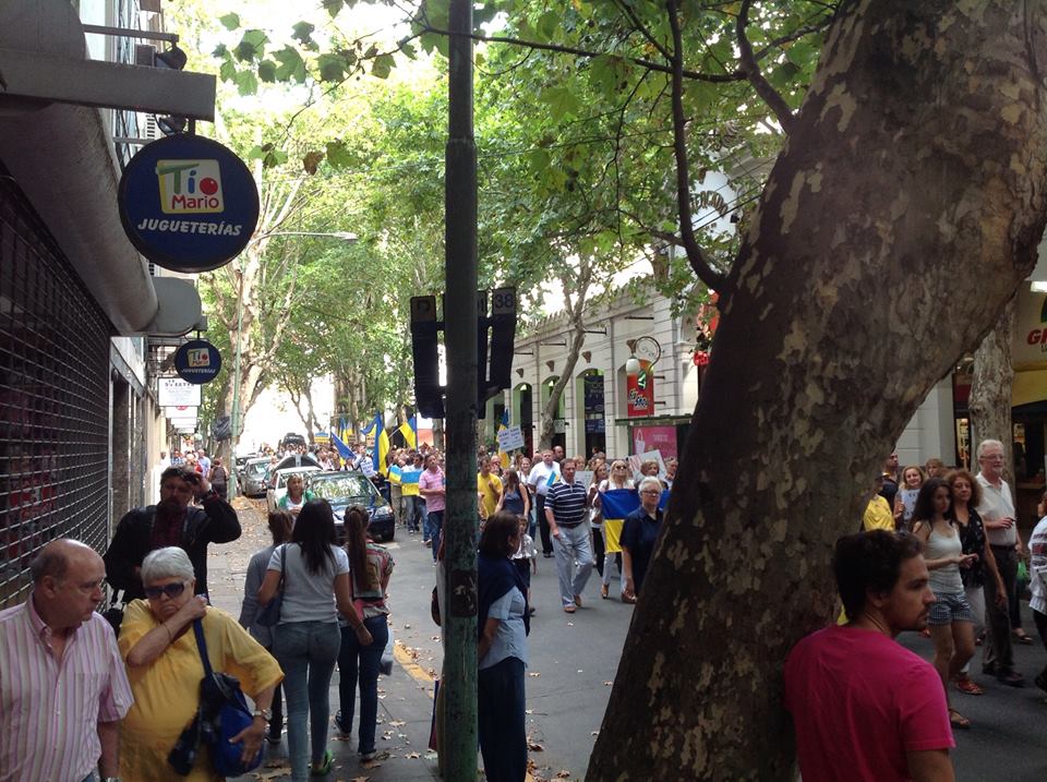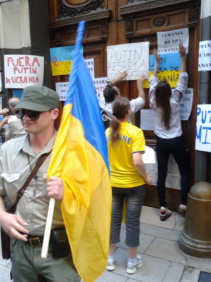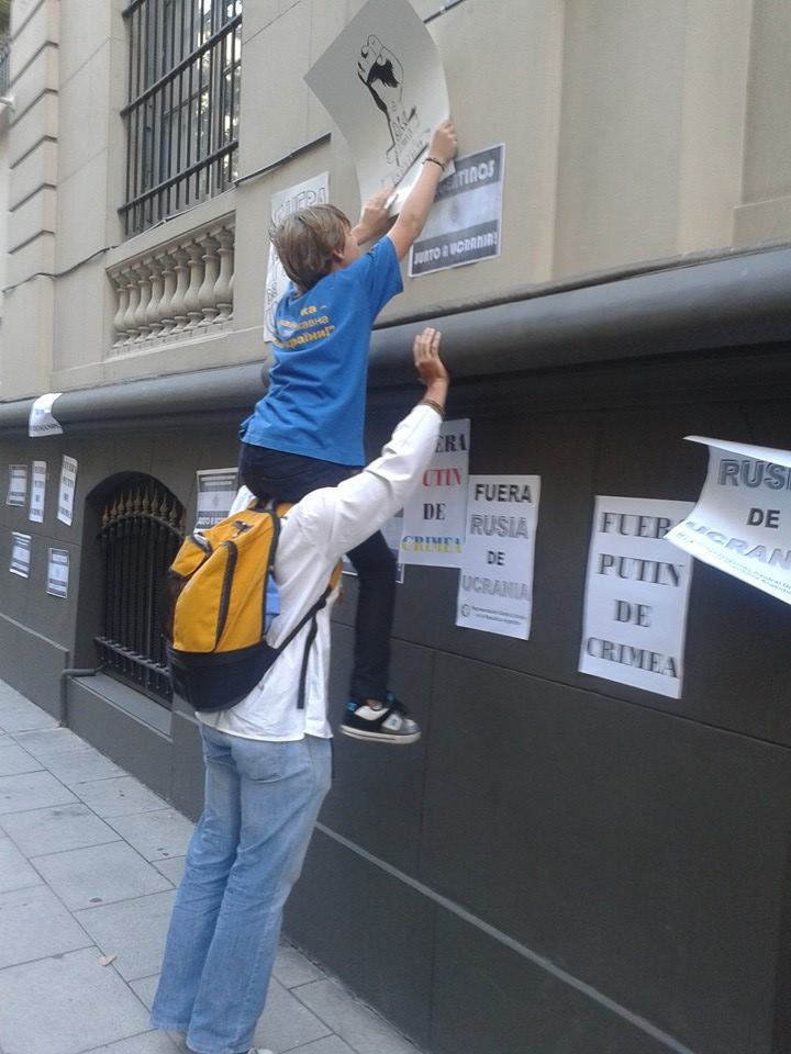 Con las banderas ucranias y con carteles expresando frases alusivas al acontecimiento, tales como “Fuera Putin de Crimea”, “No a la guerra en Ucrania”, “Fuera Putin de Ucrania”, “Putin saca las manos de ucranias”, entre otras. La columna se dirigió frente a la Embajada de la Federación de Rusia en la República Argentina.
