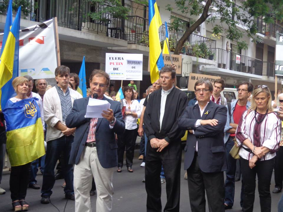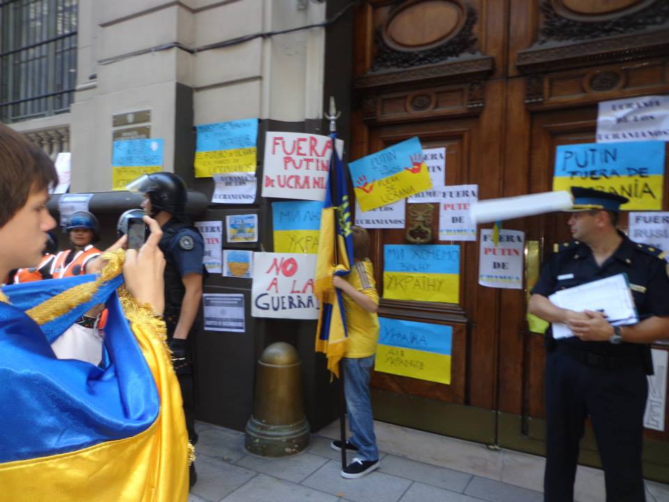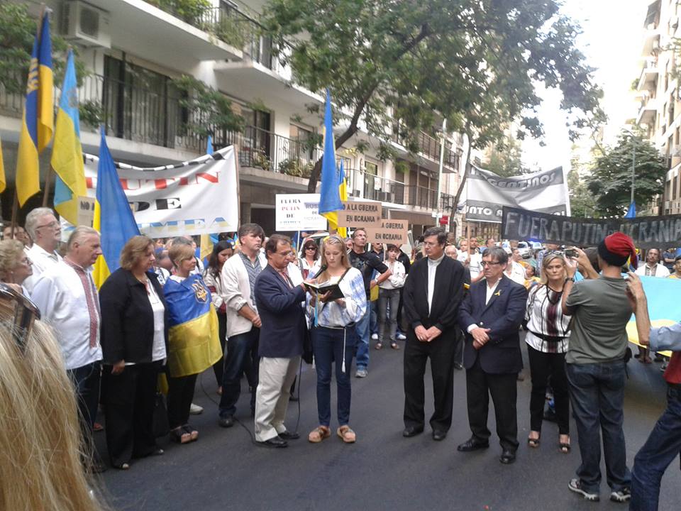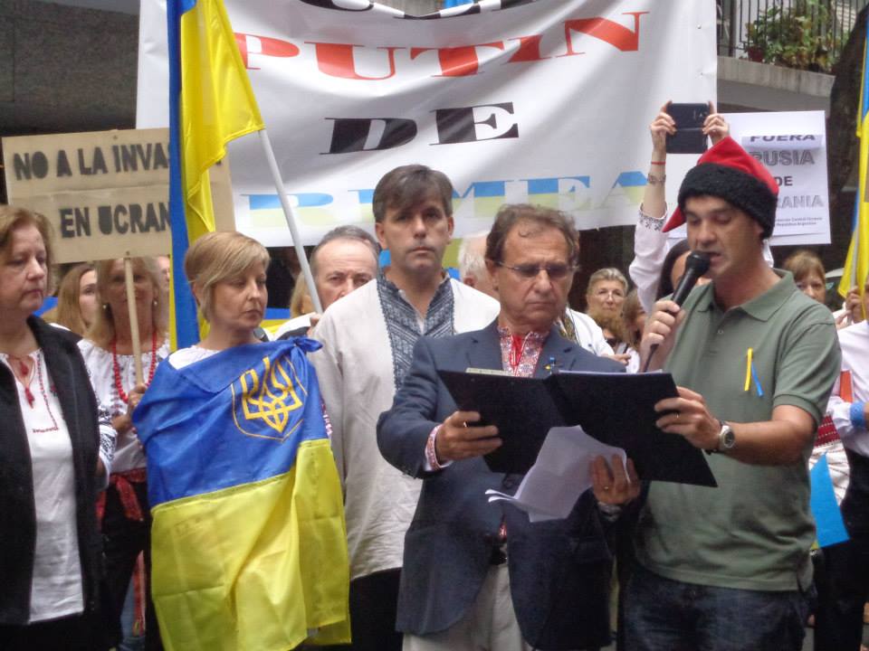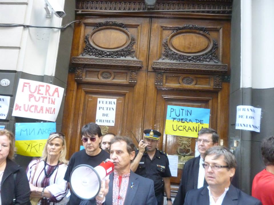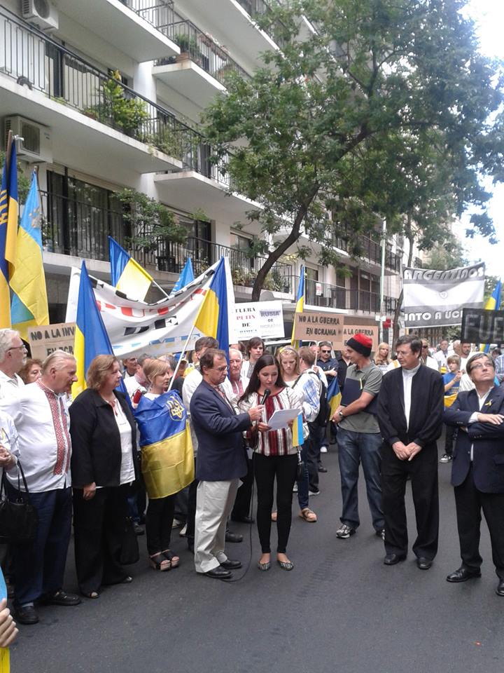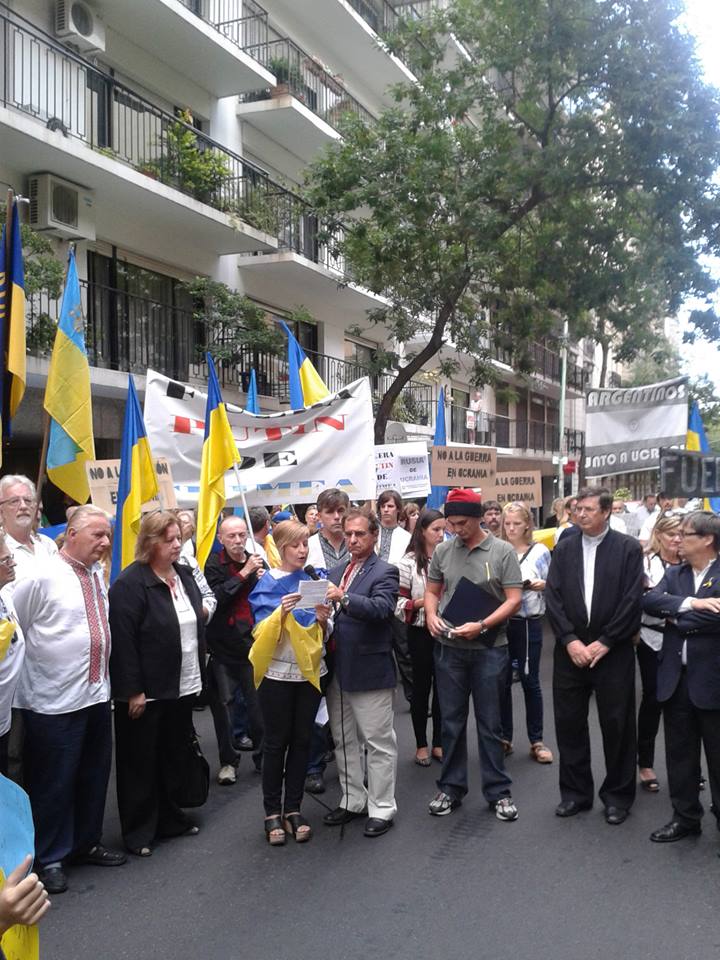 En las puertas de la Embajada el Dr. Andrés Wasylyk de la Asociación Juvenil Ucrania Plast, leyó la carta que estaba dirigida al Sr. Embajador Extraordinario y Plenipotenciario de la Federación de Rusia en la República Argentina, en la cual se llama a la reflexión a las autoridades gubernamentales de la Federación Rusa encabezadas por el presidente Vladimir Putin, y la exigencia del inmediato retiro de los efectivos militares a sus asentamientos originales y a cesar en la intromisión en los asuntos internos del Estado Ucranio y dar cumplimiento al Memorándum de Budapest de 1994 acerca de la soberanía de Ucrania y la integridad de su territorio y poder así contribuir a la construcción de un futuro conjunto de paz y amistad.