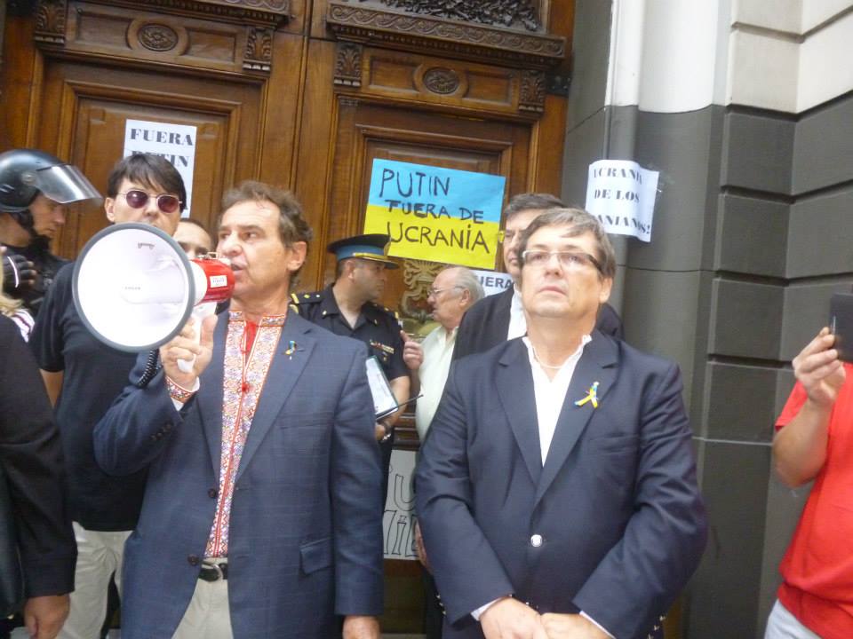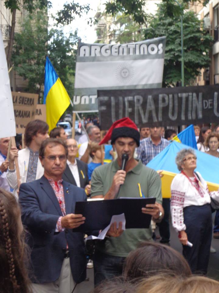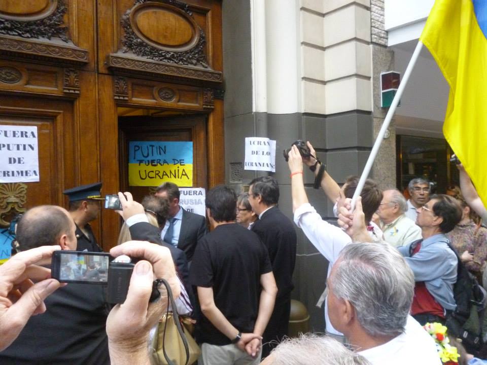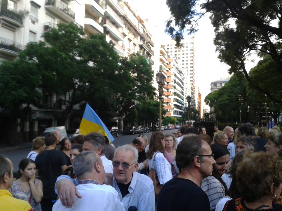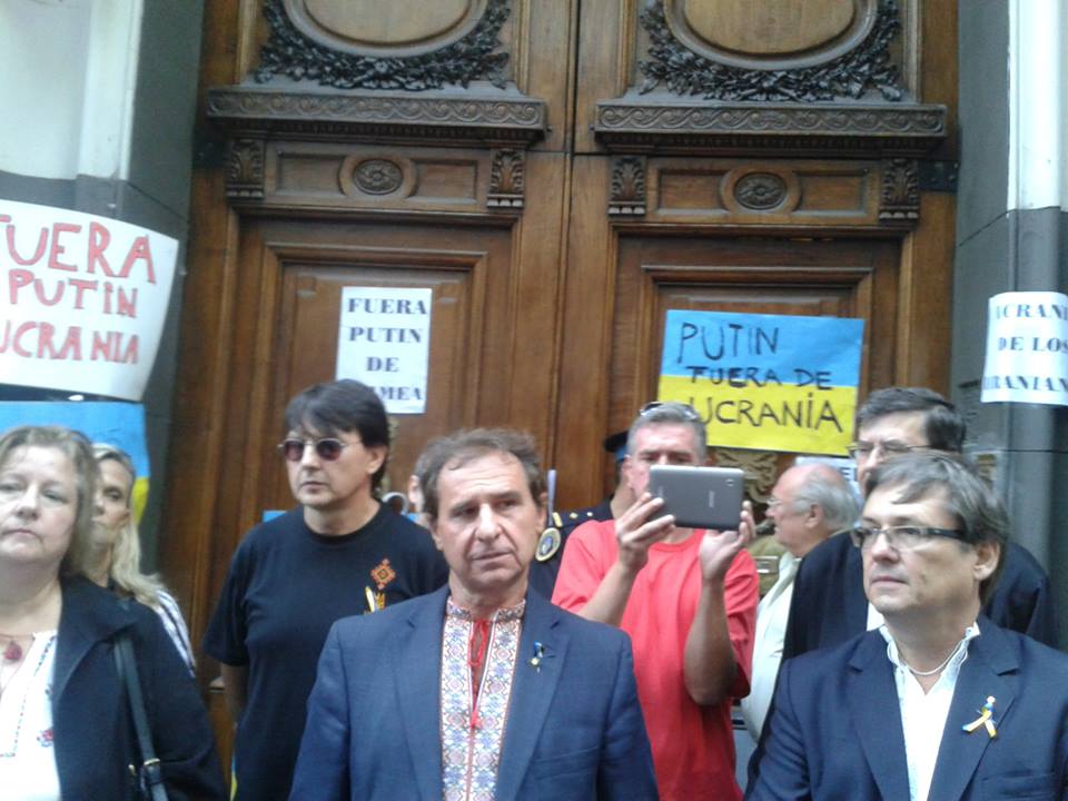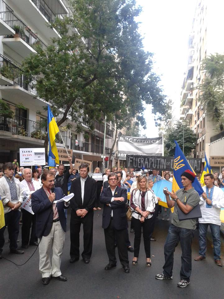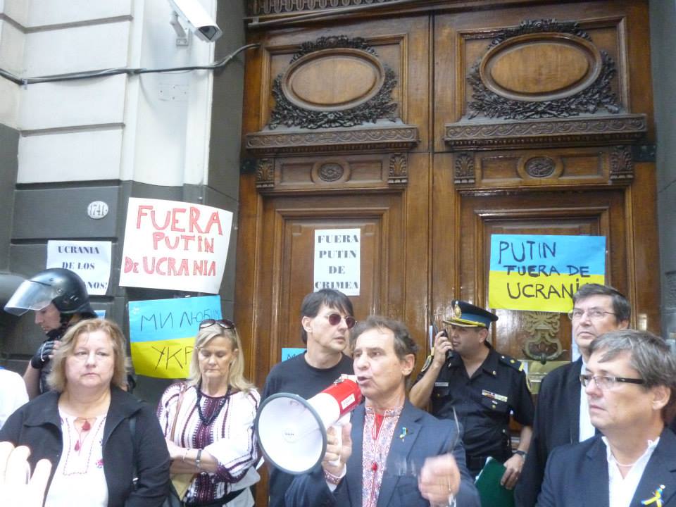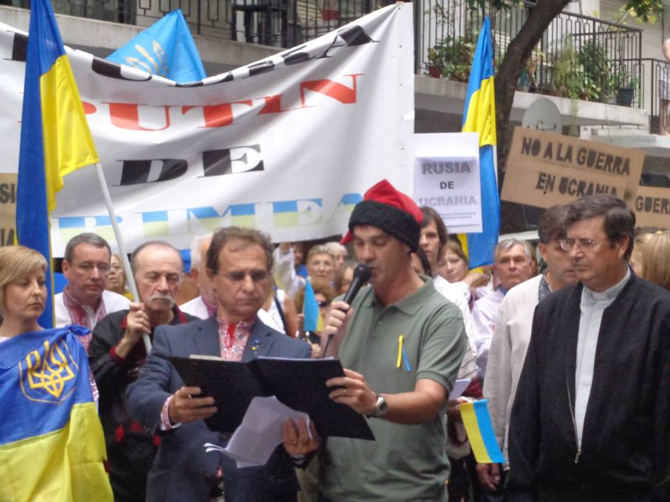 En las puertas de la Embajada el Dr. Andrés Wasylyk de la Asociación Juvenil Ucrania Plast, leyó la carta que estaba dirigida al Sr. Embajador Extraordinario y Plenipotenciario de la Federación de Rusia en la República Argentina, en la cual se llama a la reflexión a las autoridades gubernamentales de la Federación Rusa encabezadas por el presidente Vladimir Putin, y la exigencia del inmediato retiro de los efectivos militares a sus asentamientos originales y a cesar en la intromisión en los asuntos internos del Estado Ucranio y dar cumplimiento al Memorándum de Budapest de 1994 acerca de la soberanía de Ucrania y la integridad de su territorio y poder así contribuir a la construcción de un futuro conjunto de paz y amistad.
