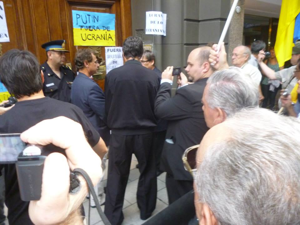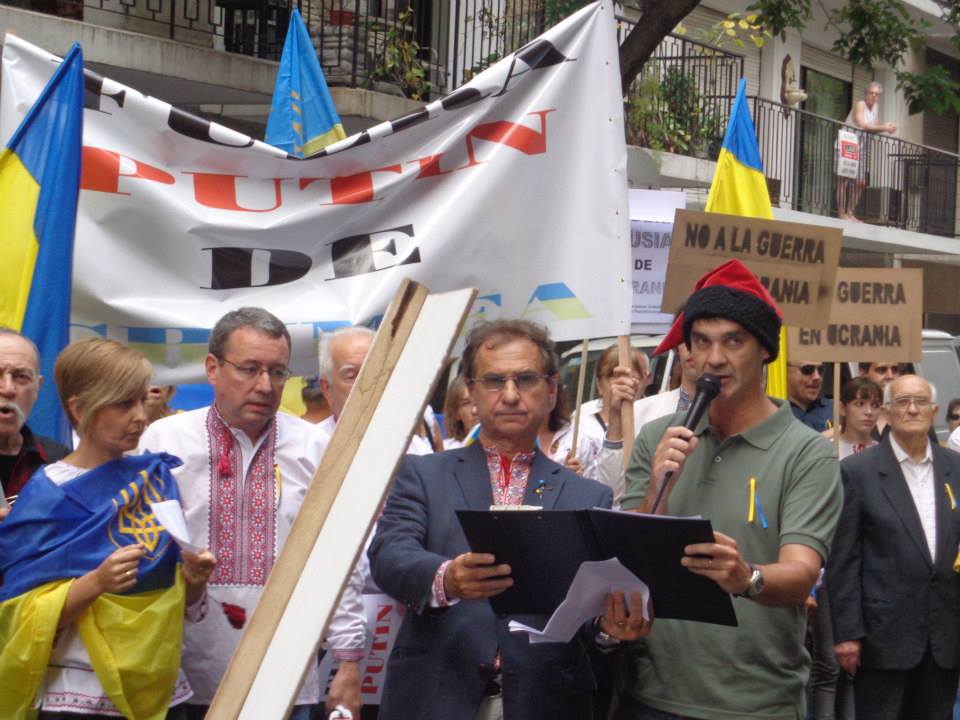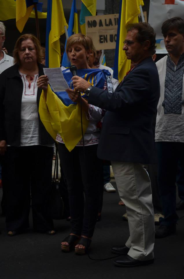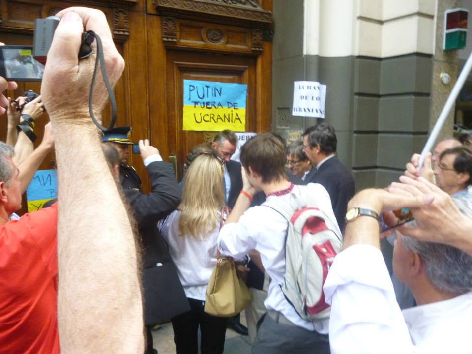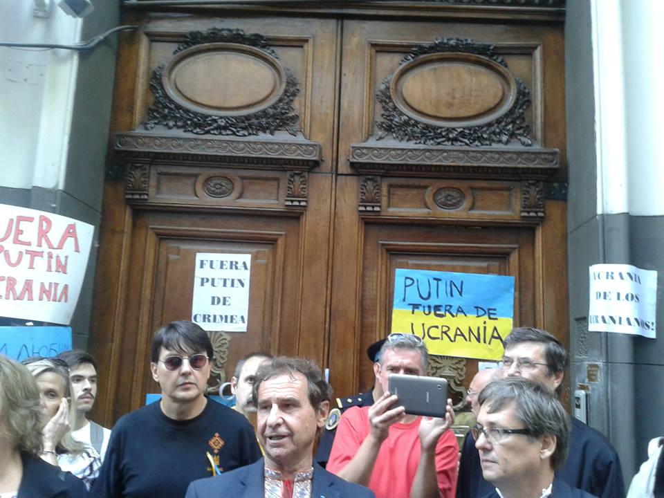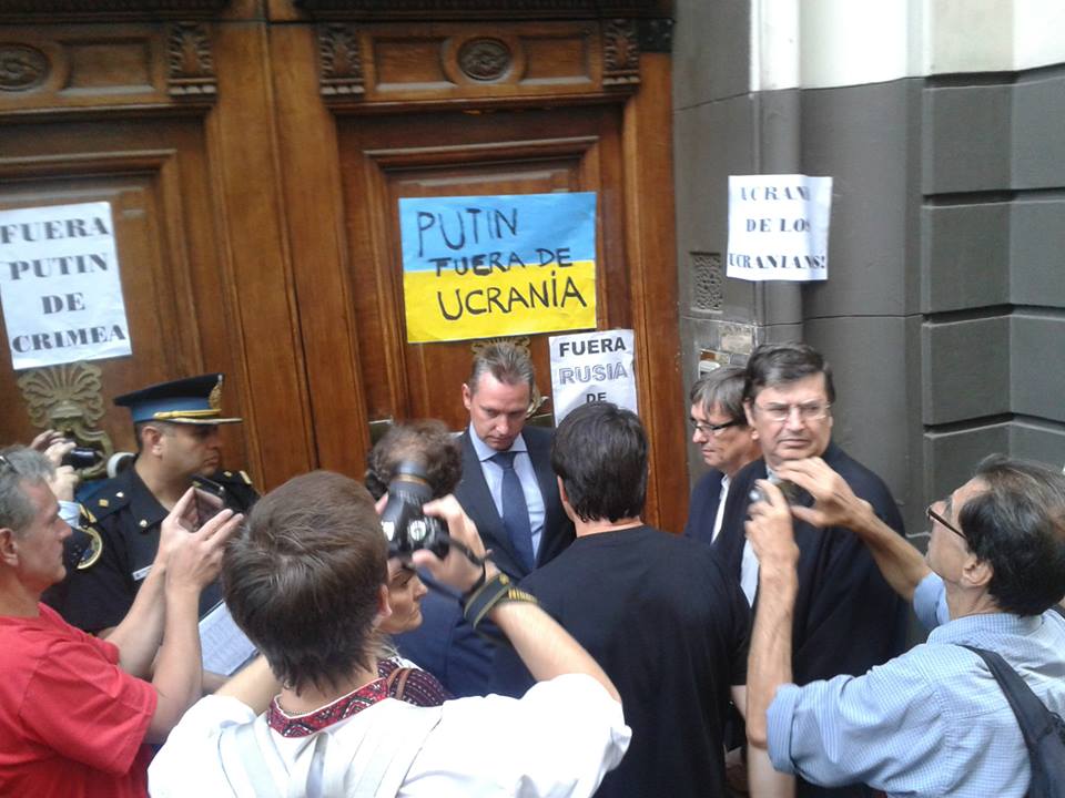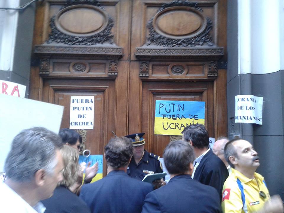 En las puertas de la Embajada el Dr. Andrés Wasylyk de la Asociación Juvenil Ucrania Plast, leyó la carta que estaba dirigida al Sr. Embajador Extraordinario y Plenipotenciario de la Federación de Rusia en la República Argentina, en la cual se llama a la reflexión a las autoridades gubernamentales de la Federación Rusa encabezadas por el presidente Vladimir Putin, y la exigencia del inmediato retiro de los efectivos militares a sus asentamientos originales y a cesar en la intromisión en los asuntos internos del Estado Ucranio y dar cumplimiento al Memorándum de Budapest de 1994 acerca de la soberanía de Ucrania y la integridad de su territorio y poder así contribuir a la construcción de un futuro conjunto de paz y amistad.