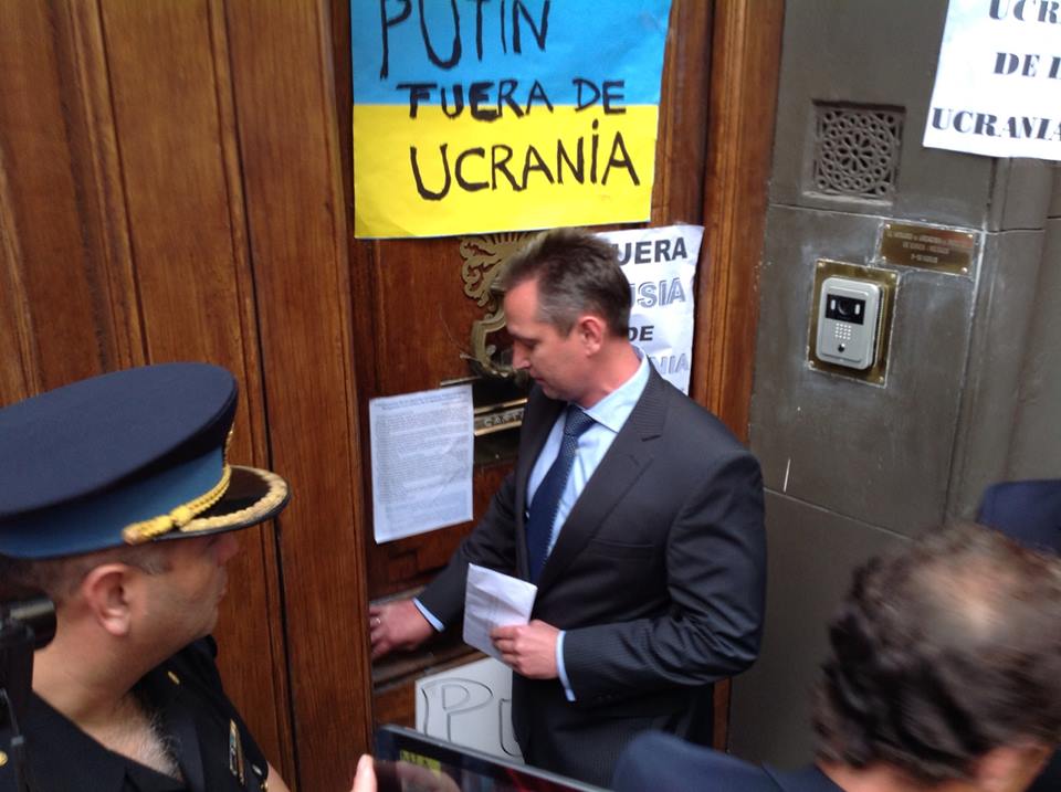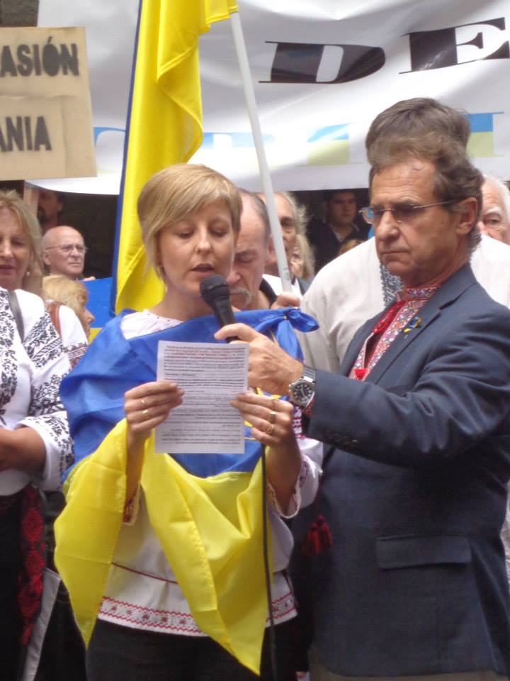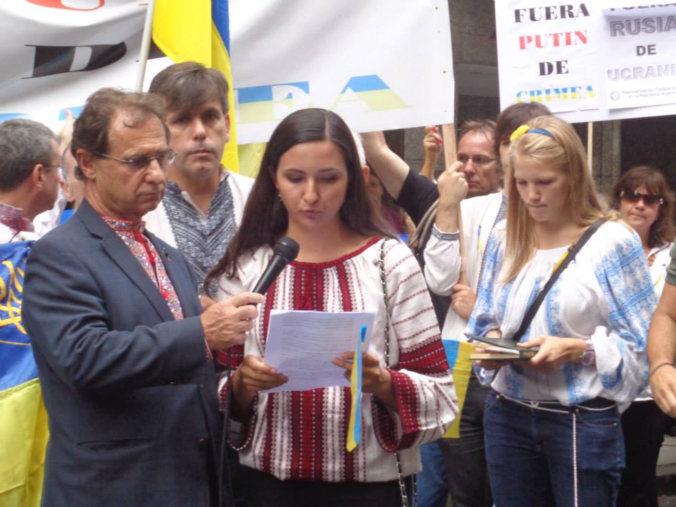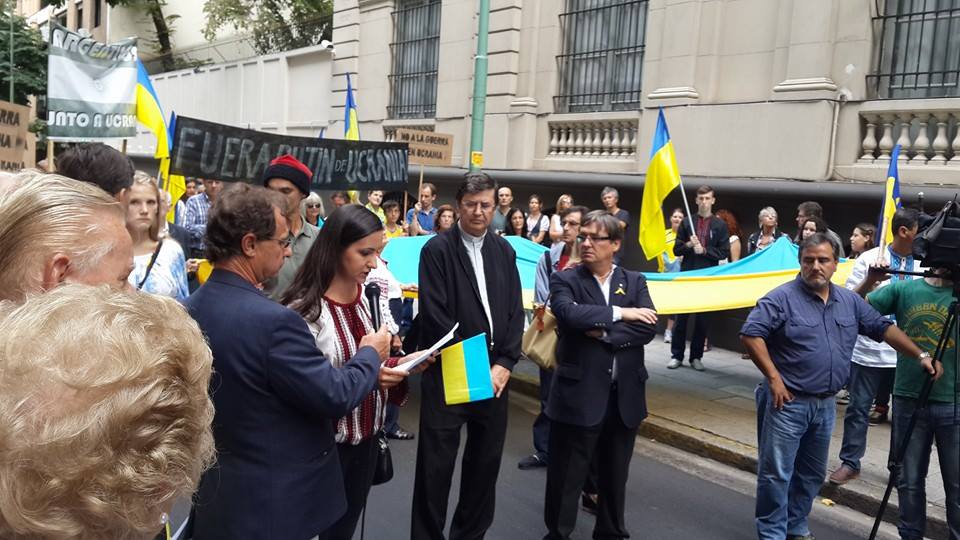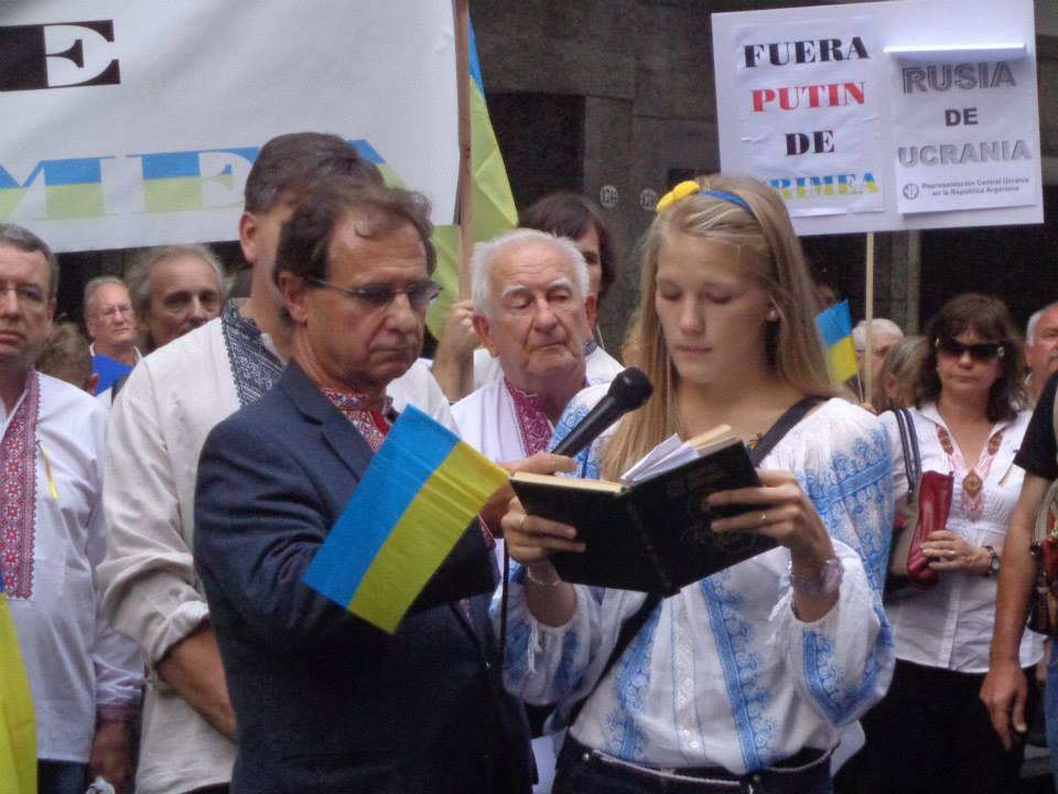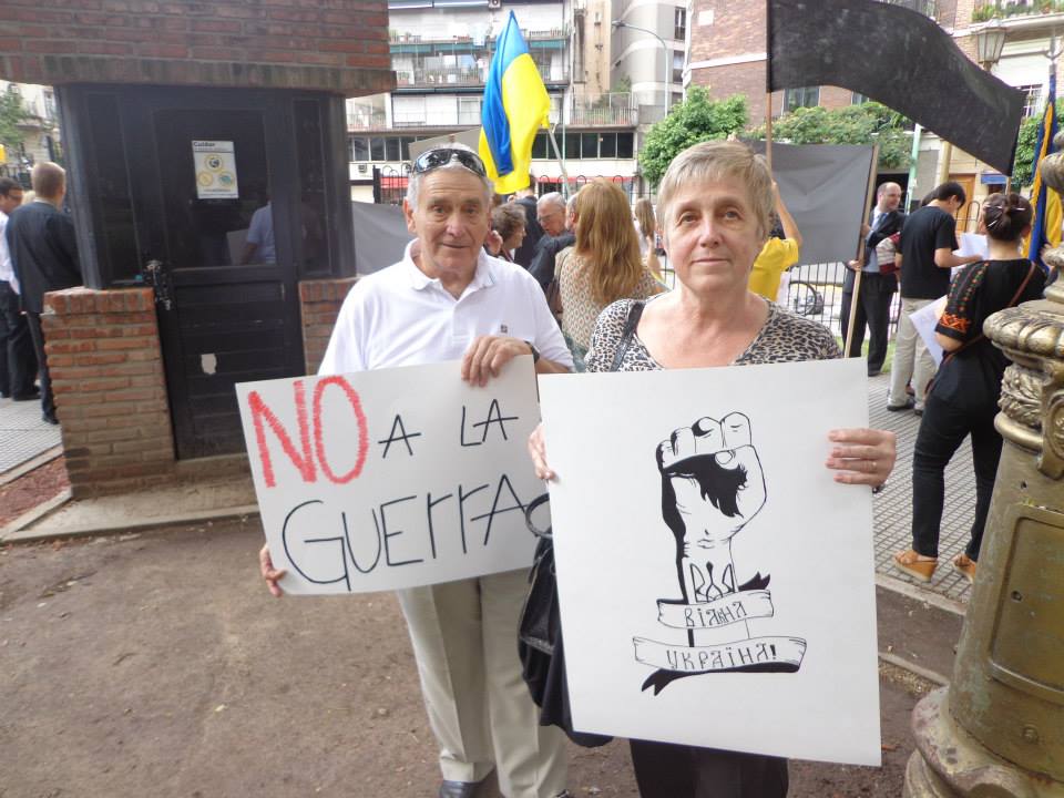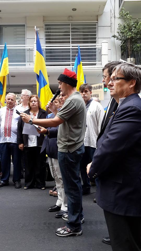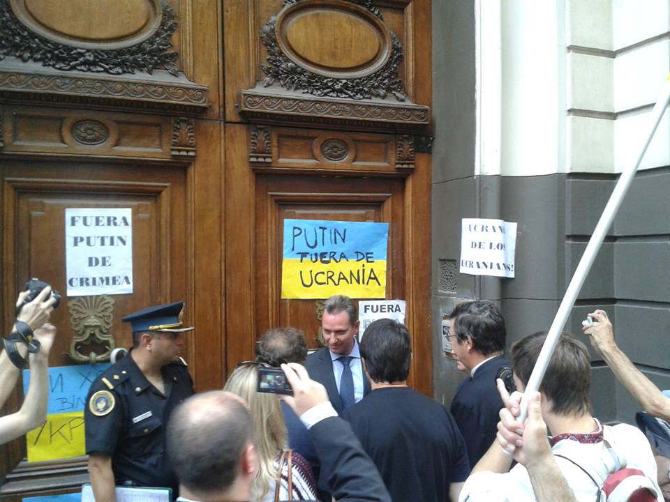 En las puertas de la Embajada el Dr. Andrés Wasylyk de la Asociación Juvenil Ucrania Plast, leyó la carta que estaba dirigida al Sr. Embajador Extraordinario y Plenipotenciario de la Federación de Rusia en la República Argentina, en la cual se llama a la reflexión a las autoridades gubernamentales de la Federación Rusa encabezadas por el presidente Vladimir Putin, y la exigencia del inmediato retiro de los efectivos militares a sus asentamientos originales y a cesar en la intromisión en los asuntos internos del Estado Ucranio y dar cumplimiento al Memorándum de Budapest de 1994 acerca de la soberanía de Ucrania y la integridad de su territorio y poder así contribuir a la construcción de un futuro conjunto de paz y amistad.