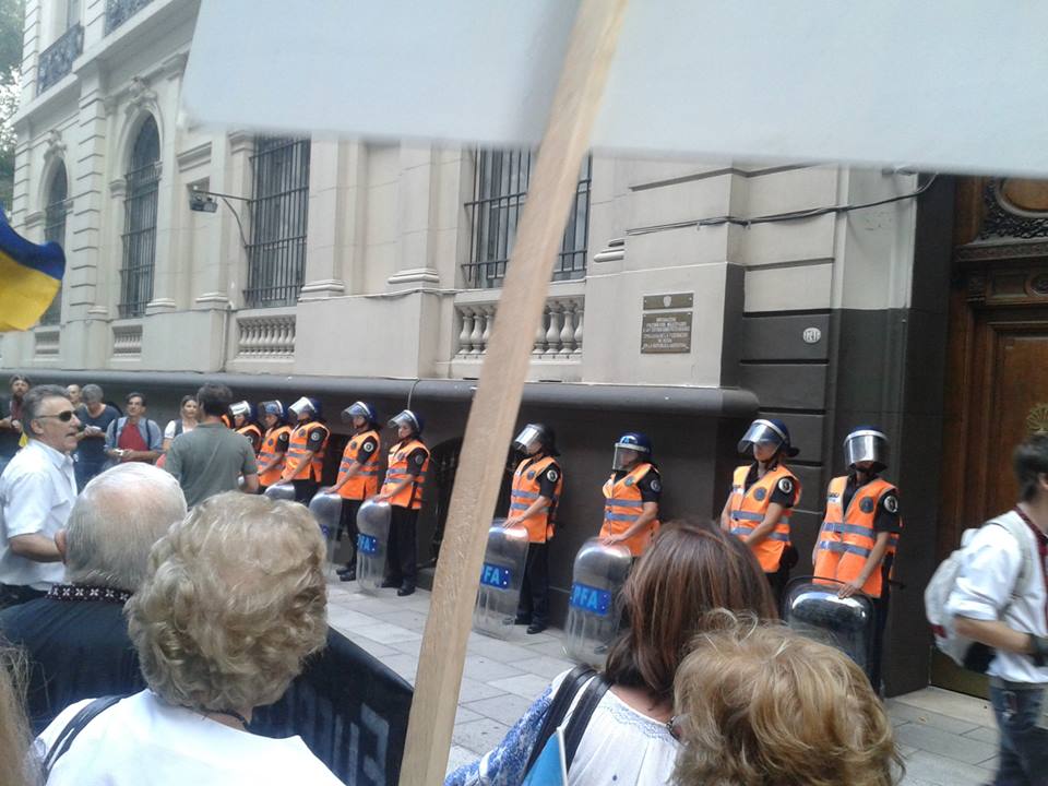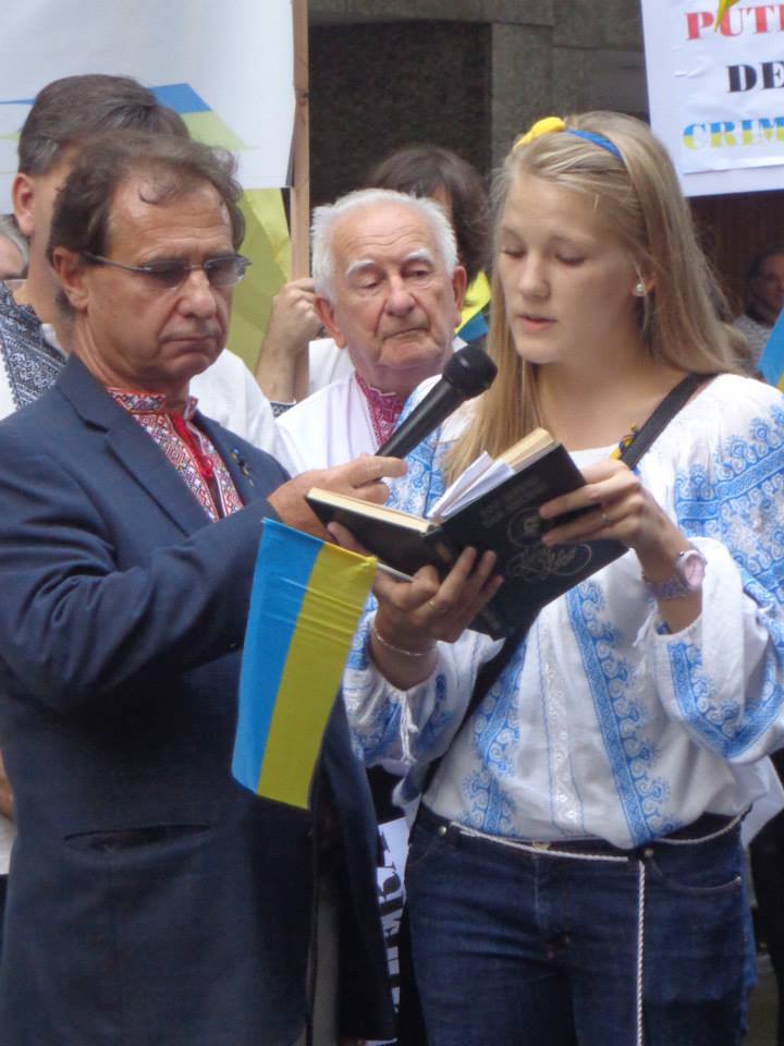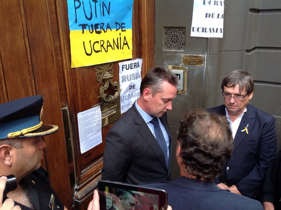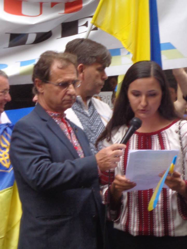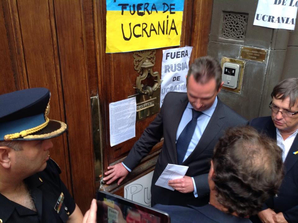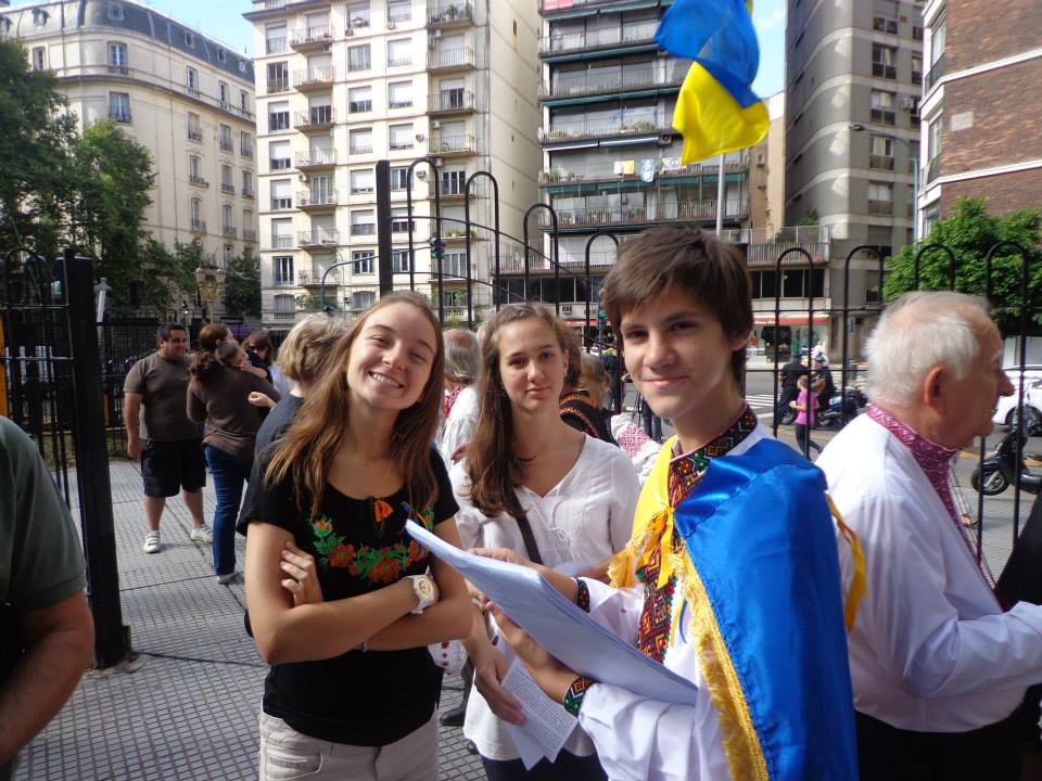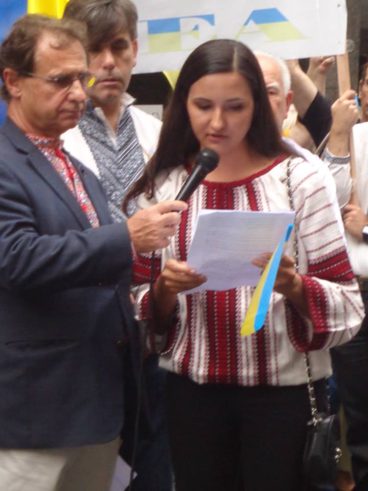 En las puertas de la Embajada el Dr. Andrés Wasylyk de la Asociación Juvenil Ucrania Plast, leyó la carta que estaba dirigida al Sr. Embajador Extraordinario y Plenipotenciario de la Federación de Rusia en la República Argentina, en la cual se llama a la reflexión a las autoridades gubernamentales de la Federación Rusa encabezadas por el presidente Vladimir Putin, y la exigencia del inmediato retiro de los efectivos militares a sus asentamientos originales y a cesar en la intromisión en los asuntos internos del Estado Ucranio y dar cumplimiento al Memorándum de Budapest de 1994 acerca de la soberanía de Ucrania y la integridad de su territorio y poder así contribuir a la construcción de un futuro conjunto de paz y amistad.