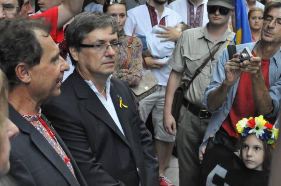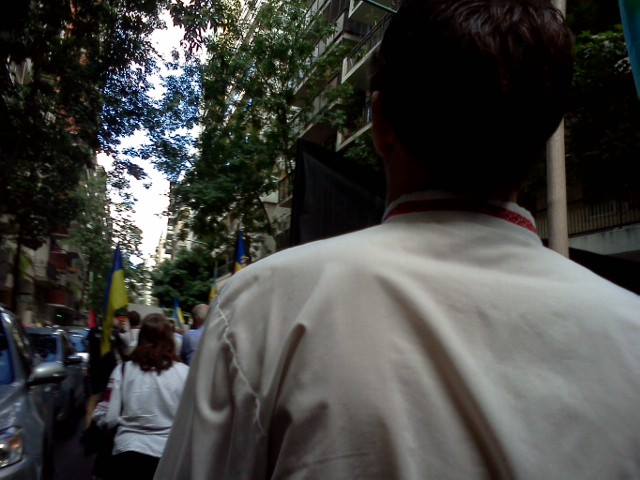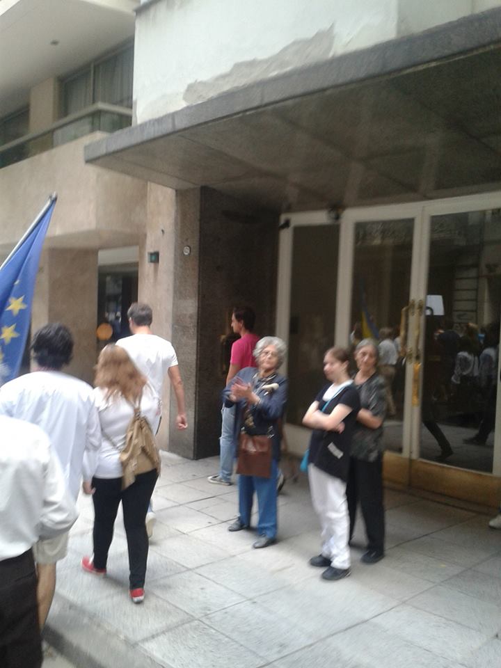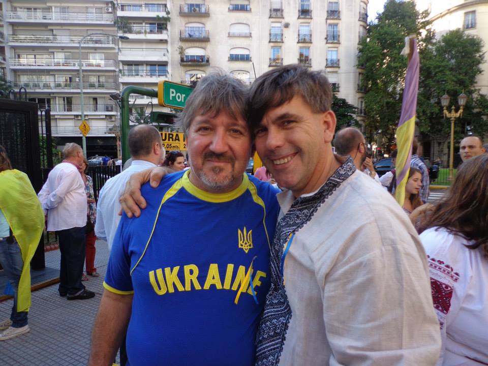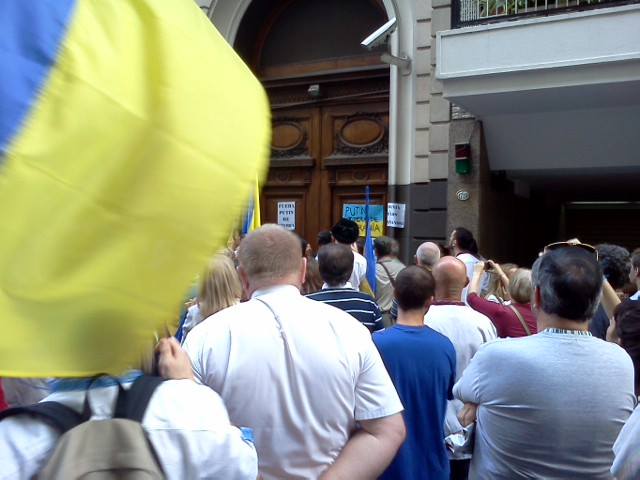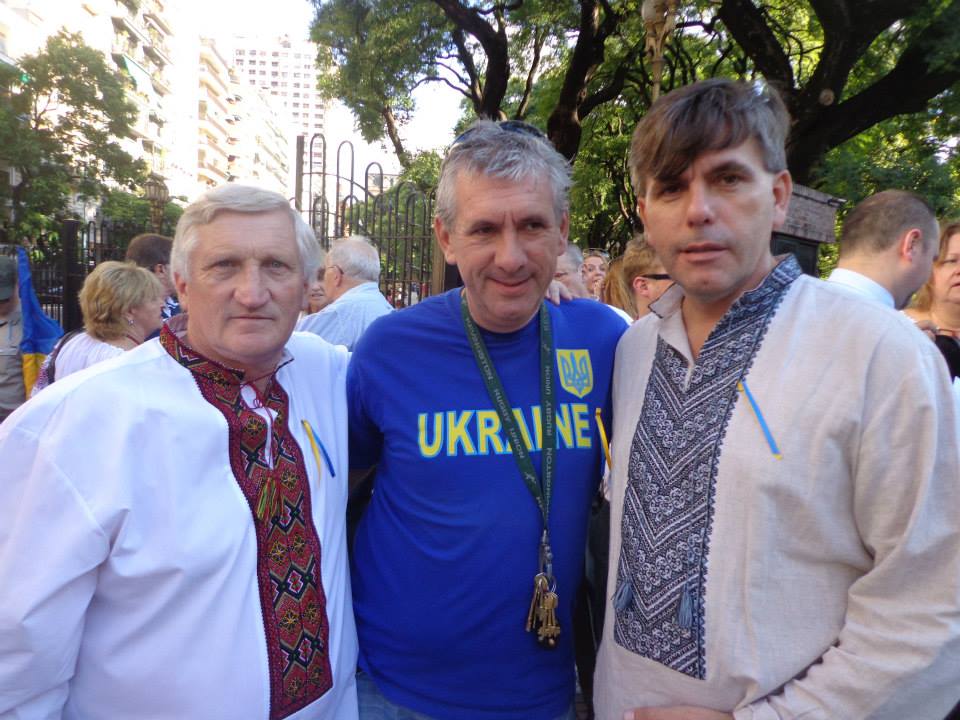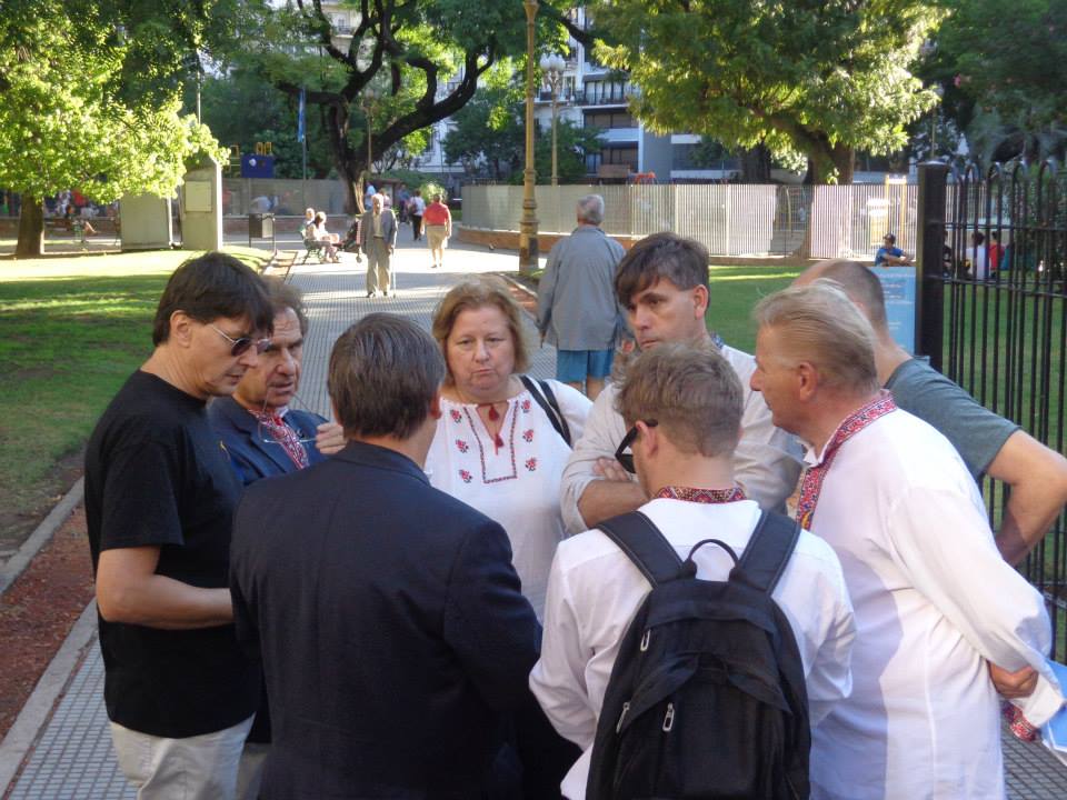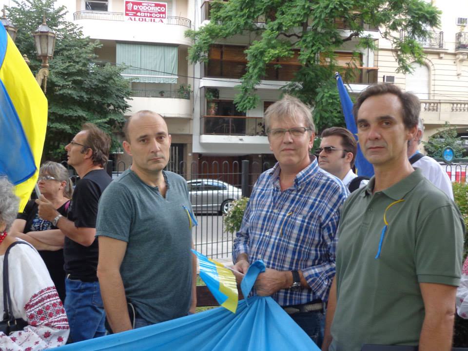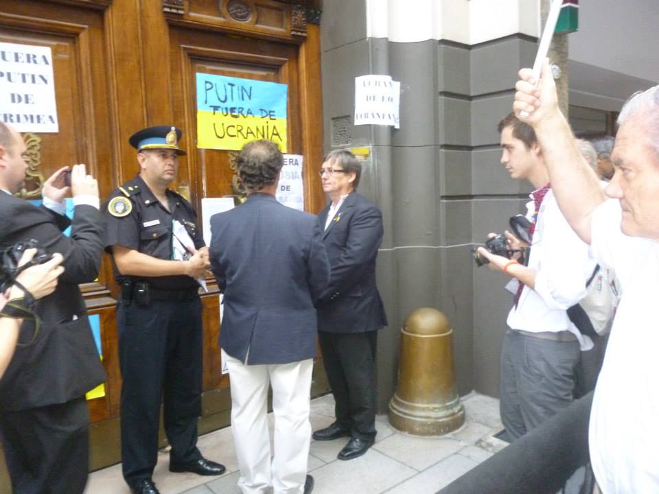 Luego el señor Presidente de la R.C.U., Prof. Dr. Pedro Lylyk, el presidente del Consejo Superior de la R.C.U. Arq. Jorge Danylyszyn y Administrador Apostólico de la Iglesia Greco Católica Ucrania en la Argentina Monseñor Daniel Kozlinsky entregaron en mano al Cónsul en la puerta de la Embajada el petitorio de nuestra comunidad ucrania en la República Argentina.