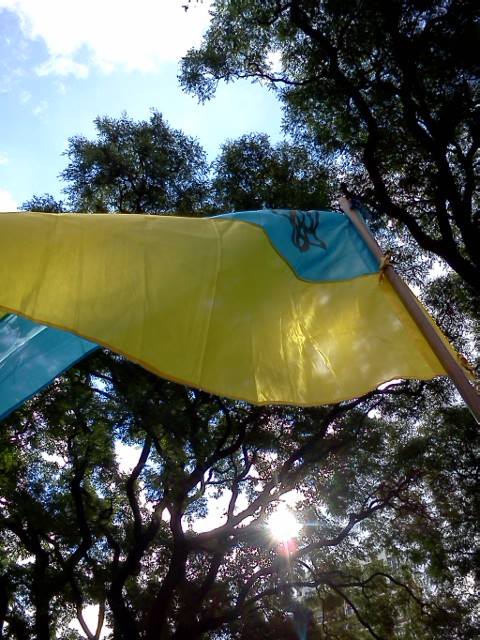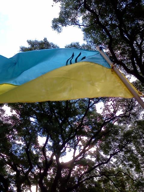Todos los participantes con el corazón palpitante de emoción, entonaron las estrofas del himno nacional Ucranio frente a la Embajada de la Federación Rusa y se vitoreo el Gloria a