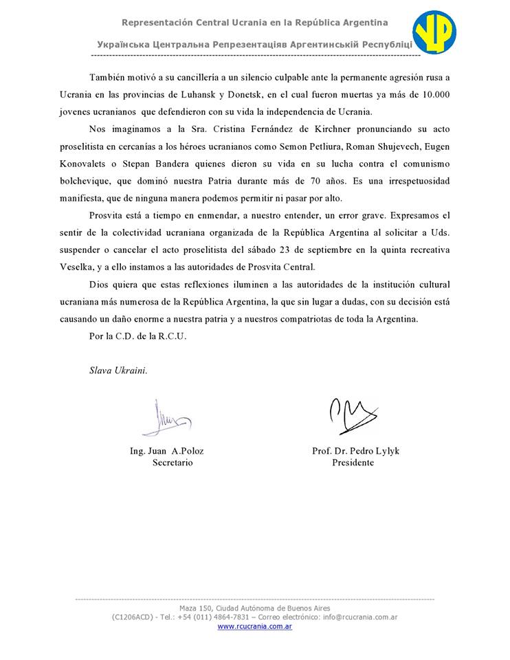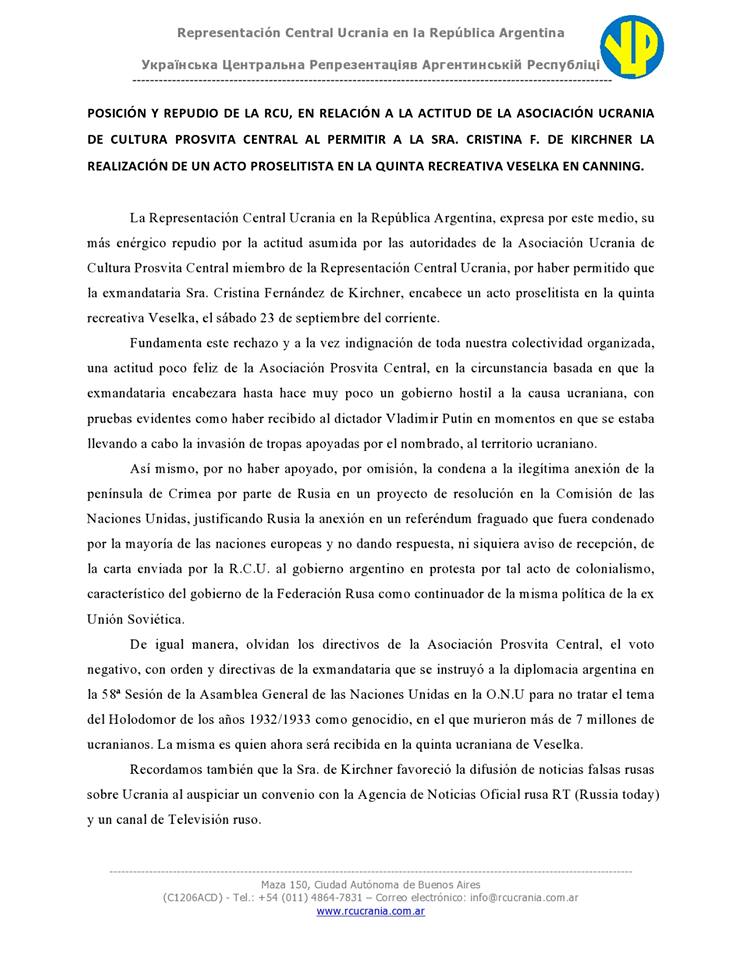POSICIÓN DE LA RCU EN RELACIÓN A LA ACTITUD DE LA ASOCIACIÓN UCRANIA DE CULTURA PROSVITA CENTRAL AL PERMITIR EL ACTO PROSELITISTA DE LA SRA. CRISTINA F. DE KIRCHNER EN LA QUINTA RECREATIVA VESELKA, EN CANNING.