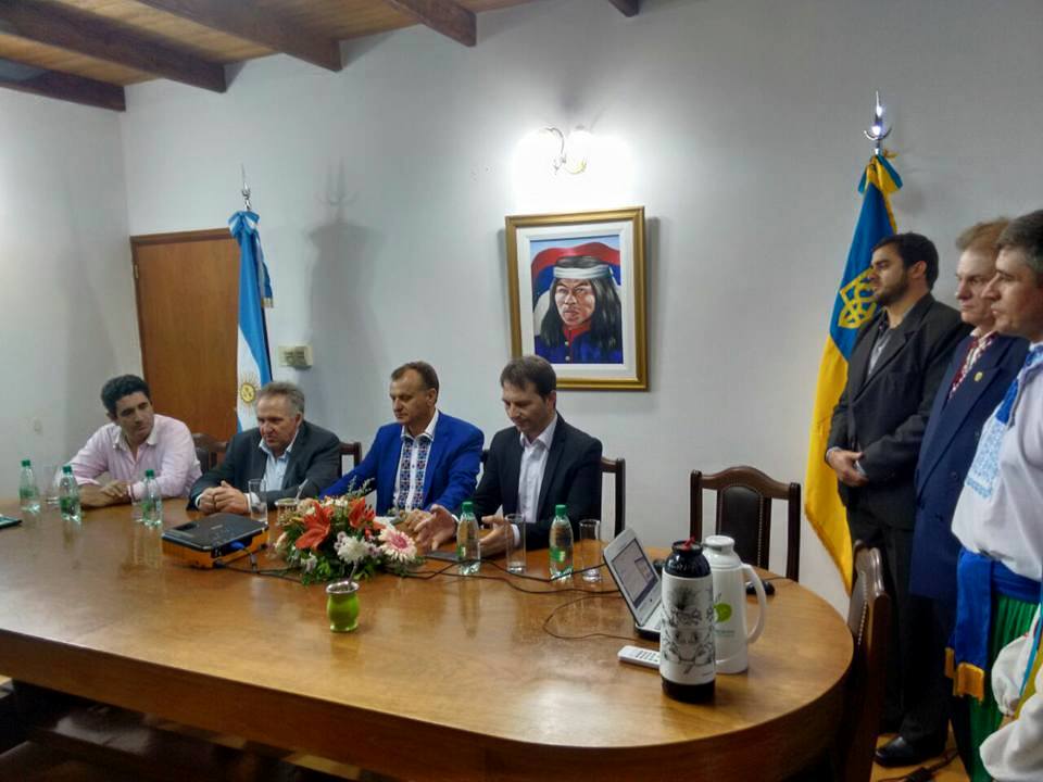 En horas de la mañana los visitantes fueron recibidos en la Sala de Situación de la Municipalidad de Apóstoles por el Pte. del Honorable Consejo Deliberante, Prof. Fabian Skuarek en representación del Intendente Lic. Mario R. Vialey, (el Lic. Vialey está de gira en Marruecos) acompañado por el Secretario de Gobierno, Lic Oscar Geijo ademas de integrantes del Gabinete Municipal, Concejales, el Vicepresidente de la RCU, Esc. Miguel A. Kovach por la Prov. de Corrientes, el Presidente de la Colectividad Ucrania de Apóstoles, Asoc. P. Ivan Seneshen, Sr Gabriel Boreski, empresarios de la zona, entre otros.