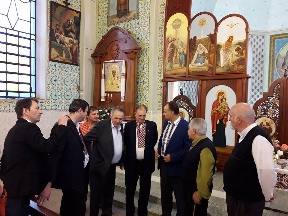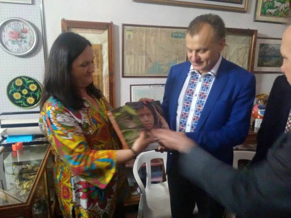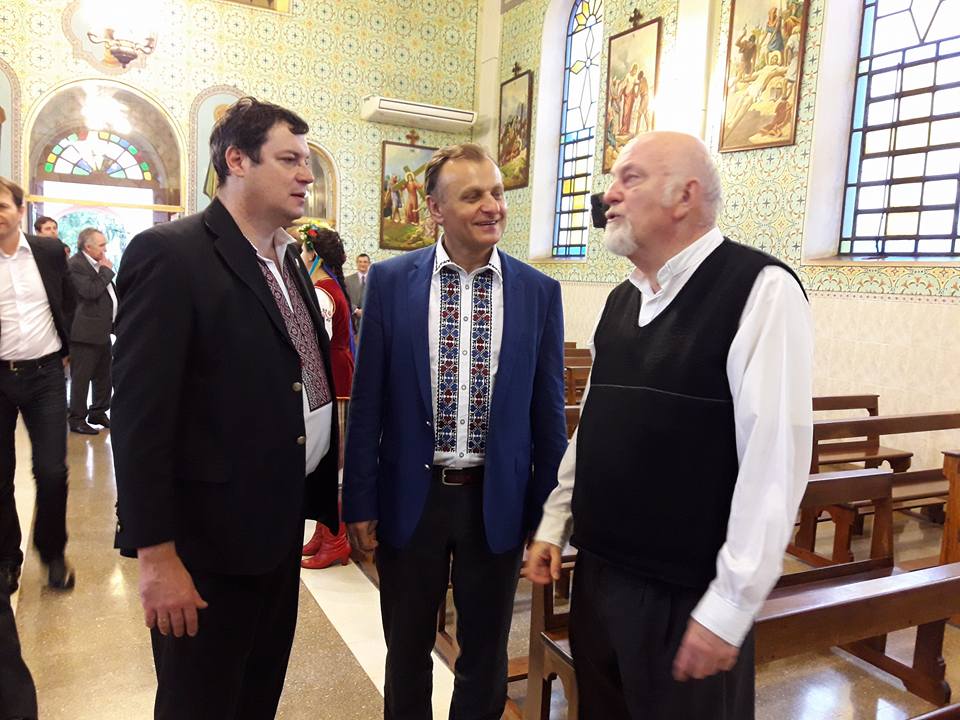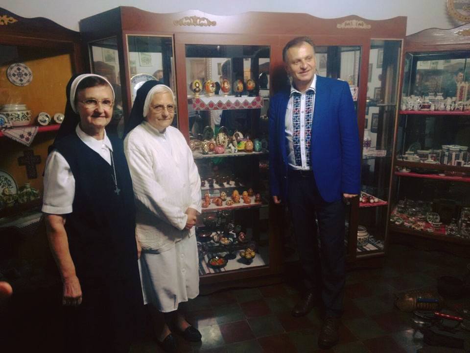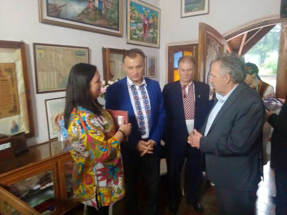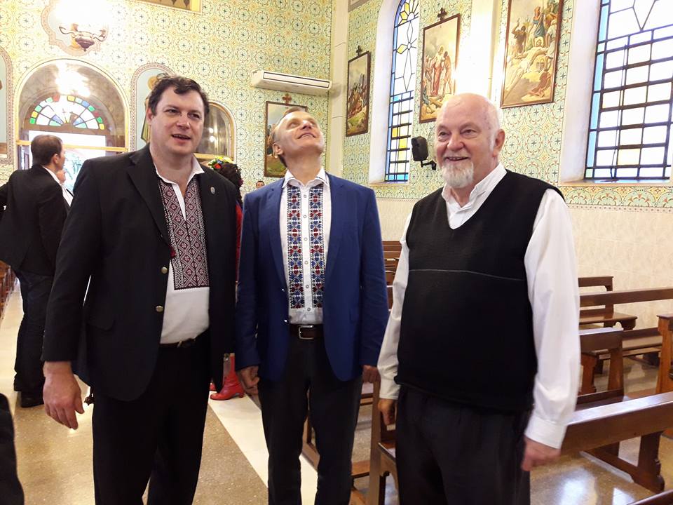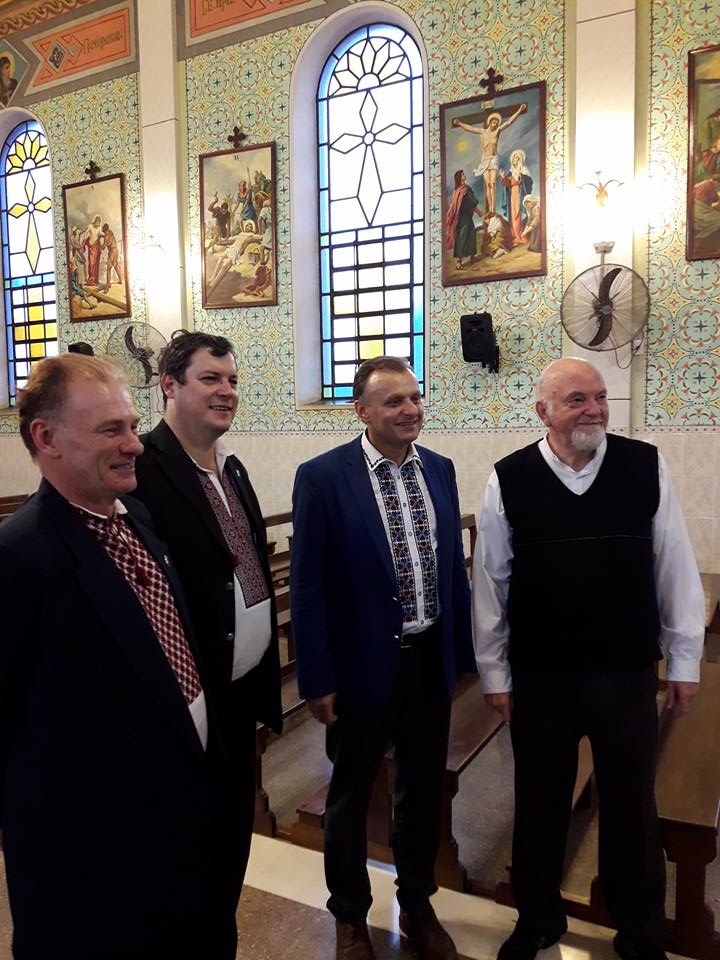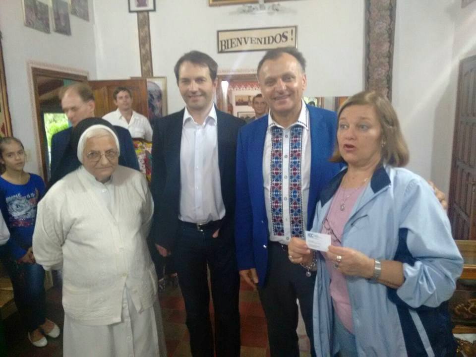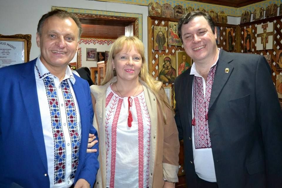 Ya en horas de la tarde y bajo una copiosa lluvia, la Delegación de dirigió al Museo Ucraniano de Apóstoles donde fue recibida por la Hna. Miguela Feyeka O.S.B.M Directora, fundadora del mismo y la Subsecretaria de Cultura de la Provincia de Misiones, Prof. Nina Lucia Mikitiuk, quien trajo los saludos del Gobernador de la Provincia de Misiones , Lic. Hugo Passalacqua, como así también por un nutrido grupo de miembros de la Colectividad Ucrania de Apóstoles. Luego de un momentos muy emotivos en donde se destacaron los intercambios de presentes y obsequios, el grupo se trasladó hasta la Iglesia de Rito Bizantino Ucranio, Stma Trinidad, donde fueron recibidos por el Superior Provincial de la Orden Basiliana, P. Ignacio Slobozian y el P. Marcos Henko a los que se les unió minutos más tarde el Obispo de la Eparquia Ucrania en la Argentina. Mons. Daniel Kozelinski Neto.